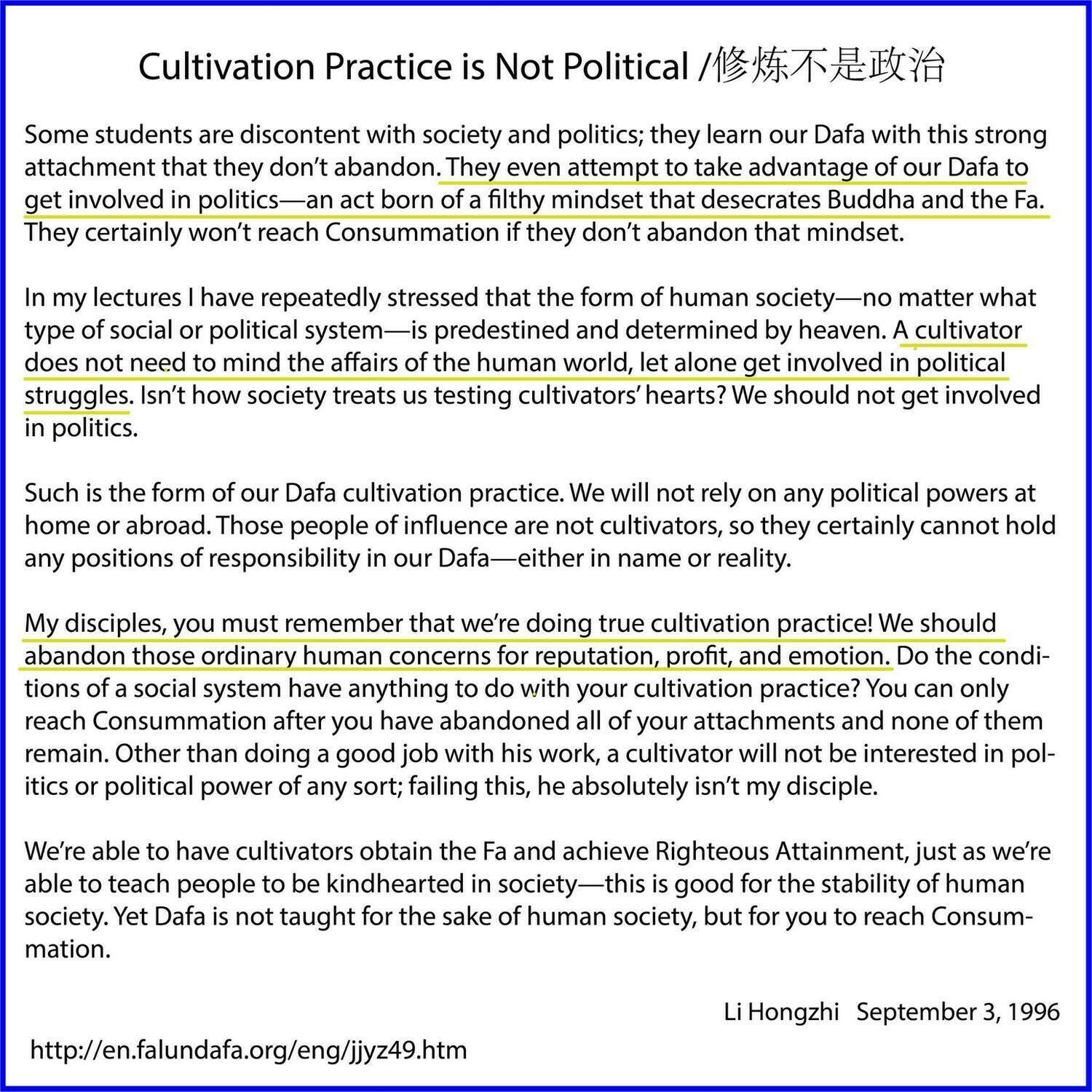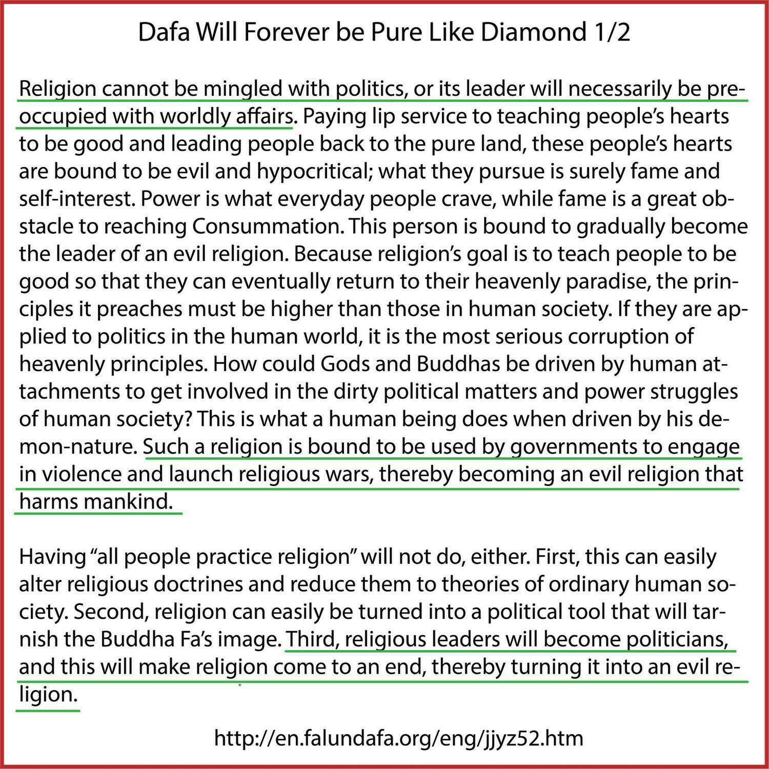 Cultivation or religion can never join together with worldly political things. Government People themselves can practice Falun Dafa, but it does not mean Falun Dafa is government.