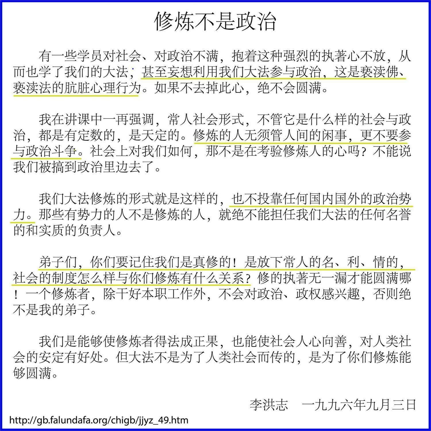 修炼的目的是回天,脱离人的层次。 而人间的政治恰恰是捆绑人留在人间的巨大束缚。 修炼的功法是不可以参与人间政治的。否则就是邪教。