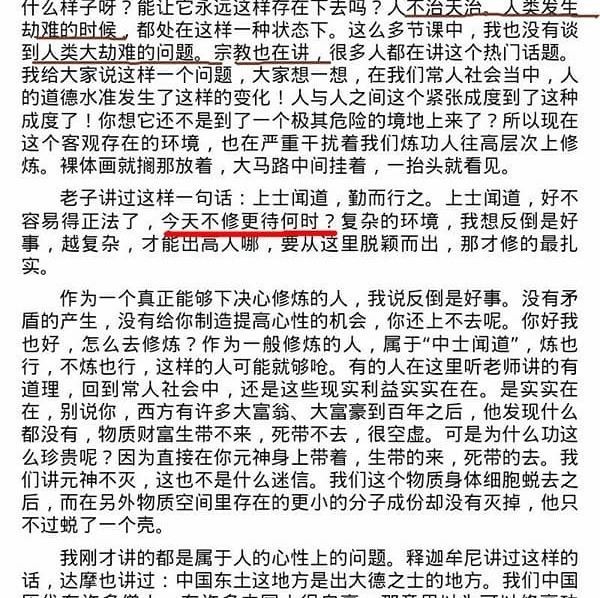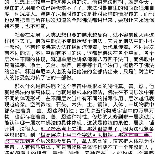 人类的历史无论走过多长时间,都只是过程而已,目的是为了引导人在历史的最后时期认识真正做人的目的。 所以不要局限在历史中留下的修炼功法中。那些功法的实质并没有传给人,只是给人留下了一个表面认识而已,让人知道预言,修炼的概念,修炼故事而已,不是真正高层次的法。 人真正等待的是法轮大法。因为法大,创世主救人的能力大,所以人可以1世修成回天,不再有轮回转世。