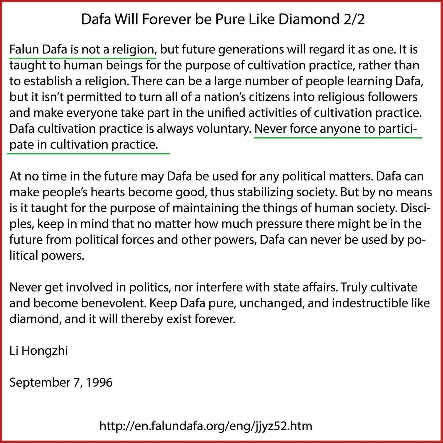 Now, you know why Falun Dafa is not a religion. Because cultivation is a self-work, nothing related with religious institute. Religion can help people to know God, but can not give salvation. It is God saves souls back to Heaven. And most importantly, God created humanity with FREEWILL. One must wish to cultivate himself/herself in will first, then comes with the salvation. There is no one can force any other to be Faith in God. If Faith can be forced, then all Americans can be saved from the beginning of this year till now.