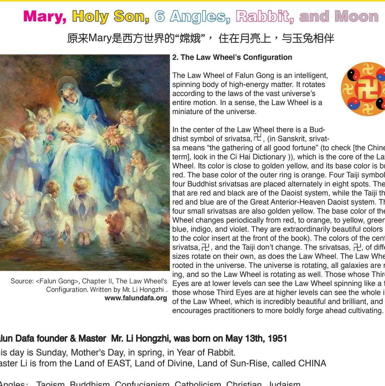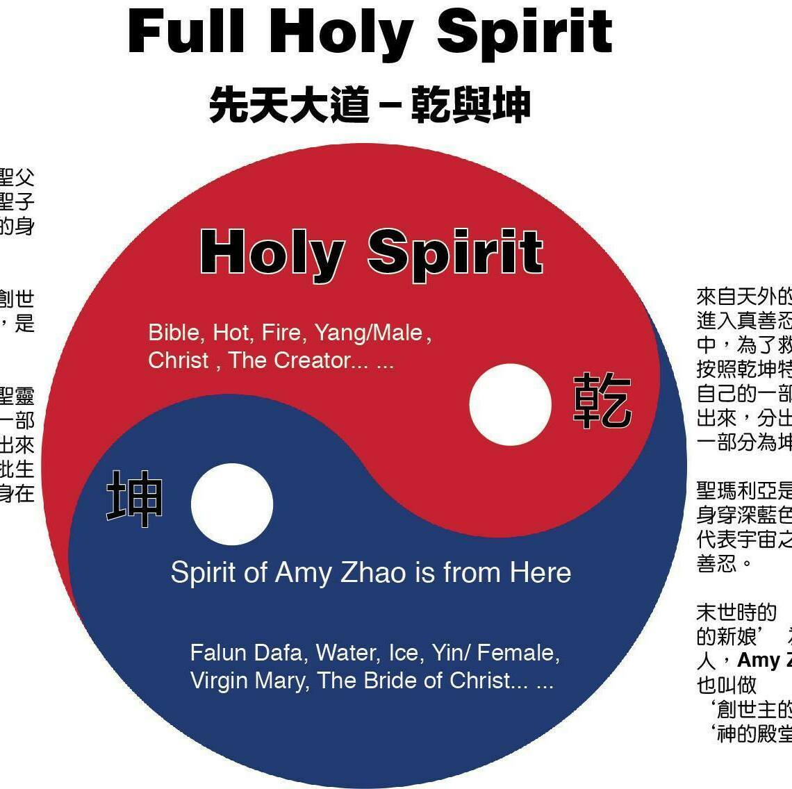來自天外的聖靈,進入真善忍大穹之中,為了救宇宙,按照乾坤特性,把自己的一部分分了出來,分出來的那一部分為坤。聖瑪利亞是月亮,身穿深藍色衣服,代表宇宙之水,真善忍。末世時的 ‘基督的新娘’ 為我本人,Amy Zhao,也叫做 ‘創世主的人身’ , ‘神的殿堂’