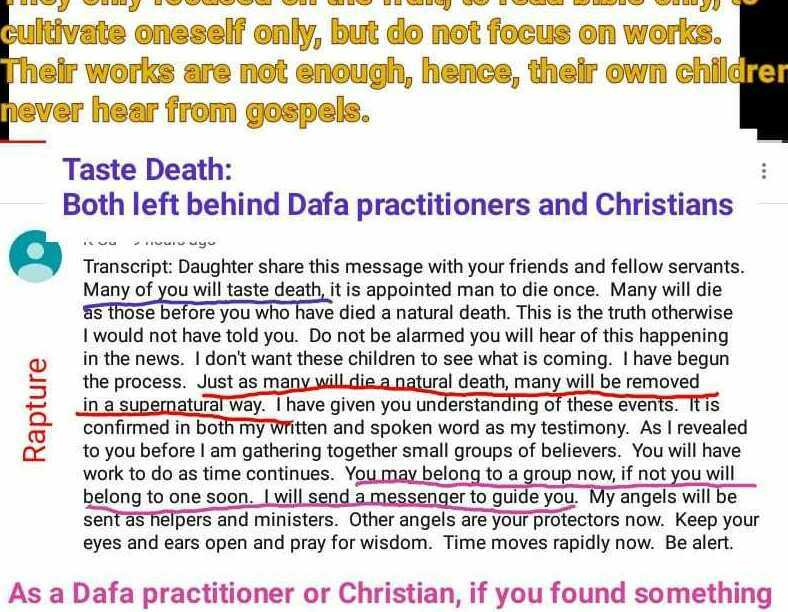 When the Rapture happens, some left behind Dafa practitioners and Christians may also die in a nature disaster death.