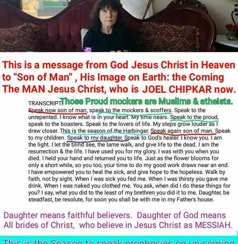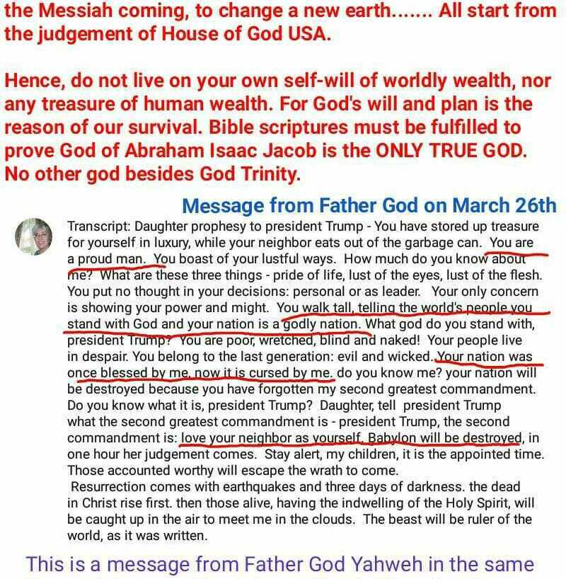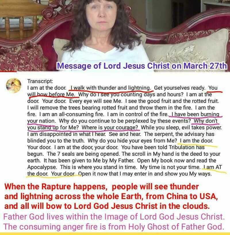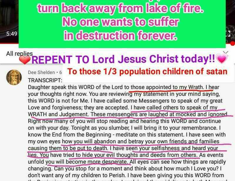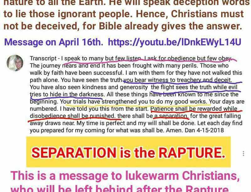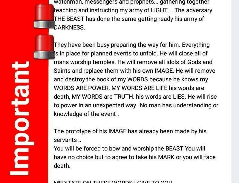 Daughter prophecy to all peoples nations and tongues. Destruction comes as the hand of God passes over the earth. I shall destroy every temple, wall, and tower that I did not direct man to build. Your women and children will be taken into captivity by those of the serpent’s seed. When you see these things come to pass you will know I am the Lord. There is no other. Men of the earth, you have allowed the serpent’s seed to infiltrate your governments, churches, and schools. The war that you have been speaking of has already started on the day of seven when the two towers built by men as an idol to himself was destroyed. The new shrine to the dead will be thrown down. When you see this you will know I am the Lord. There is no other. I shall cause ice to fall from the Heavens. When you see this you will know I am the Lord. There is no other. The prince to come will be honored and followed. Many of you will be thrown into jail. When you see this come to pass you will know I am the Lord. There is no other. My two Witnesses will speak My Word. I give them My authority to strike down any who interfere with My directive. When you see this come to pass you will know I am the Lord. There is no other. I shall direct them to strike the earth with plagues and in any manner they deem necessary to cause men to repent of the abominations I have seen with My own eyes. When you see this come to pass you will know I am the Lord. There is no other. I have given you, men of the Earth, every opportunity to come to Me. Be prepared, for the end draws closer. Will you be found on the Father’s side? Or will you be found bowing down to the beast?