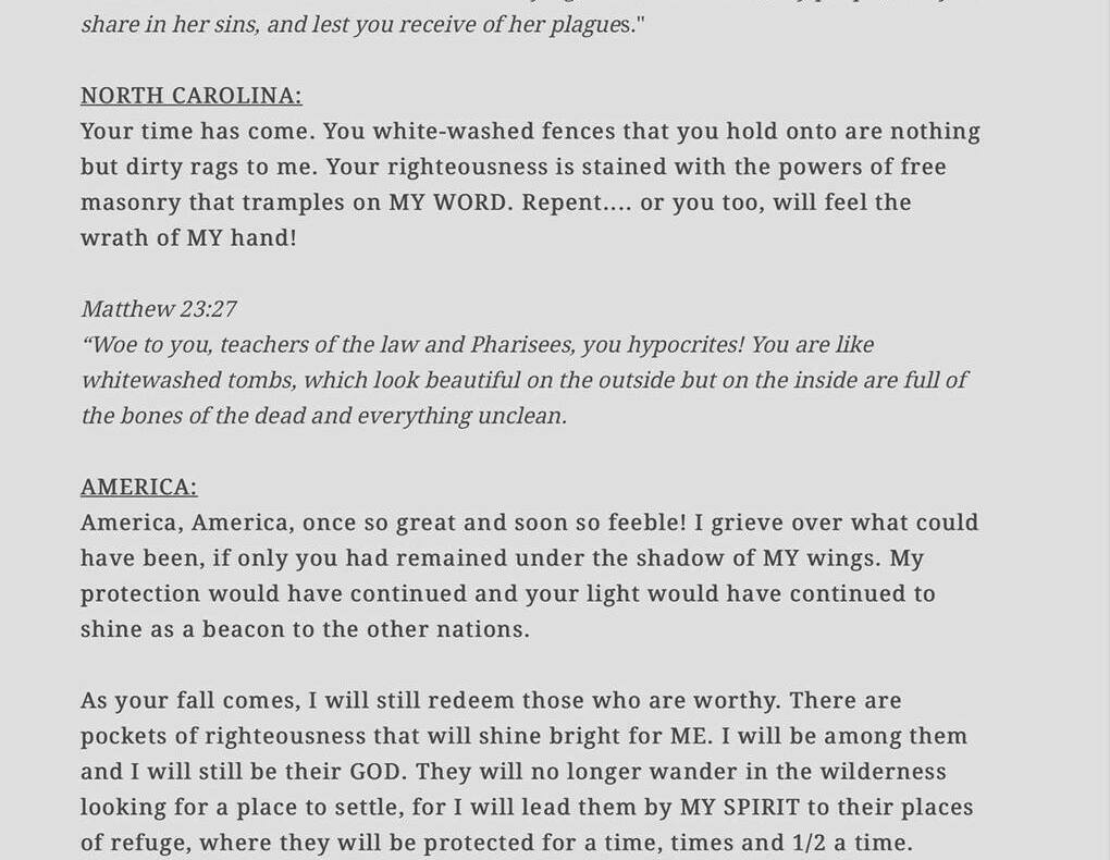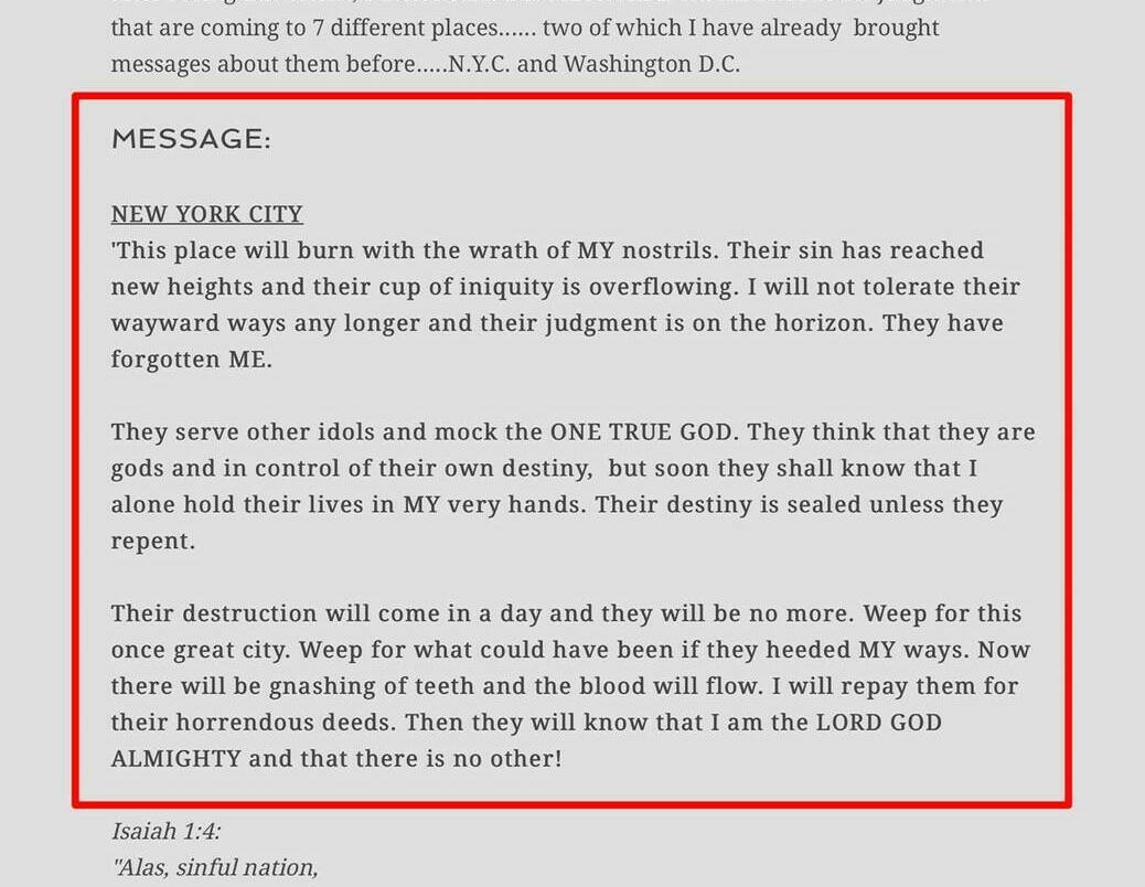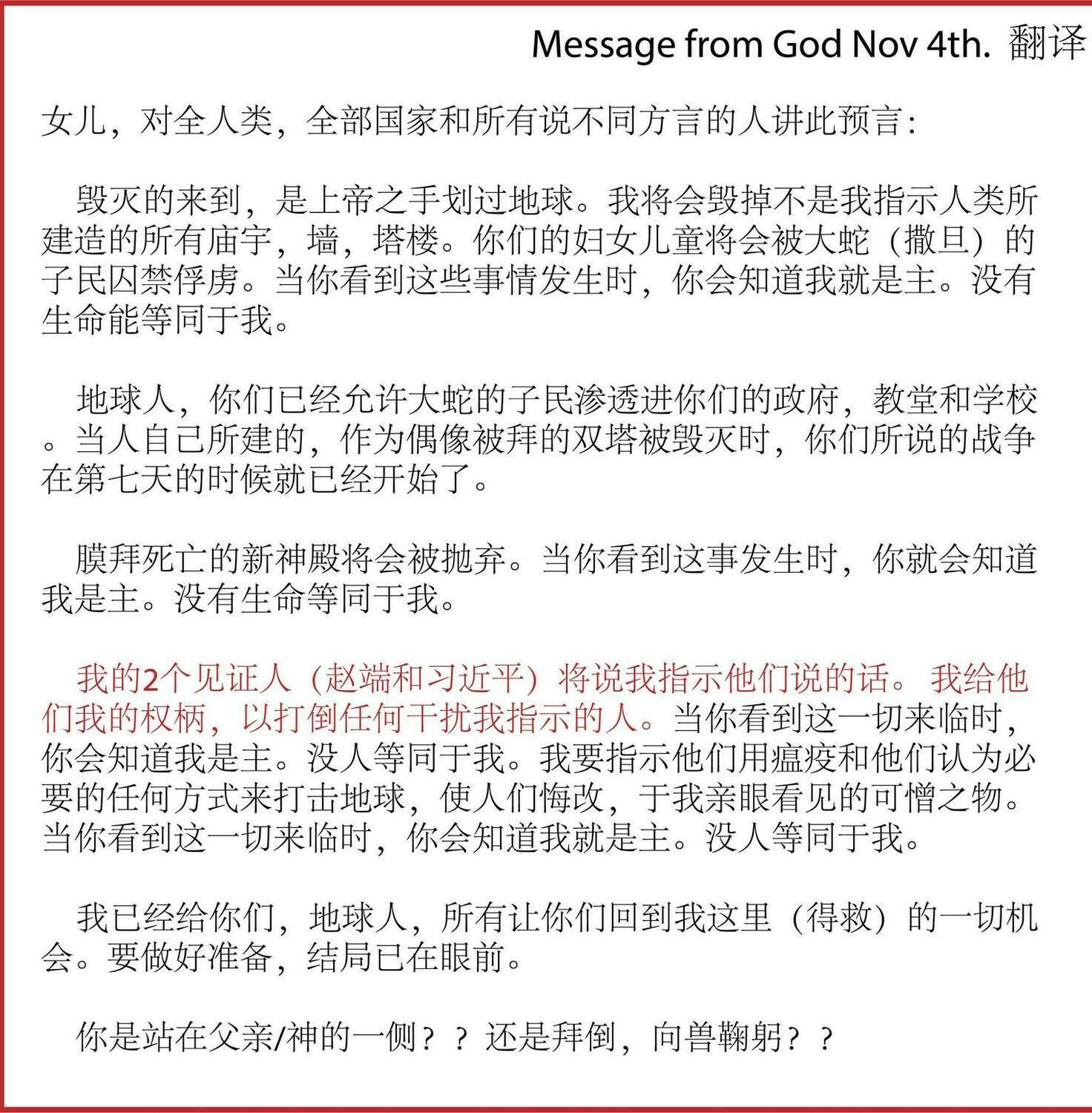 Daughter prophecy to all peoples nations and tongues. Destruction comes as the hand of God passes over the earth. I shall destroy every temple, wall, and tower that I did not direct man to build. Your women and children will be taken into captivity by those of the serpent’s seed. When you see these things come to pass you will know I am the Lord. There is no other. Men of the earth, you have allowed the serpent’s seed to infiltrate your governments, churches, and schools. The war that you have been speaking of has already started on the day of seven when the two towers built by men as an idol to himself was destroyed. The new shrine to the dead will be thrown down. When you see this you will know I am the Lord. There is no other. I shall cause ice to fall from the Heavens. When you see this you will know I am the Lord. There is no other. The prince to come will be honored and followed. Many of you will be thrown into jail. When you see this come to pass you will know I am the Lord. There is no other. My two Witnesses will speak My Word. I give them My authority to strike down any who interfere with My directive. When you see this come to pass you will know I am the Lord. There is no other. I shall direct them to strike the earth with plagues and in any manner they deem necessary to cause men to repent of the abominations I have seen with My own eyes. When you see this come to pass you will know I am the Lord. There is no other. I have given you, men of the Earth, every opportunity to come to Me. Be prepared, for the end draws closer. Will you be found on the Father’s side? Or will you be found bowing down to the beast?