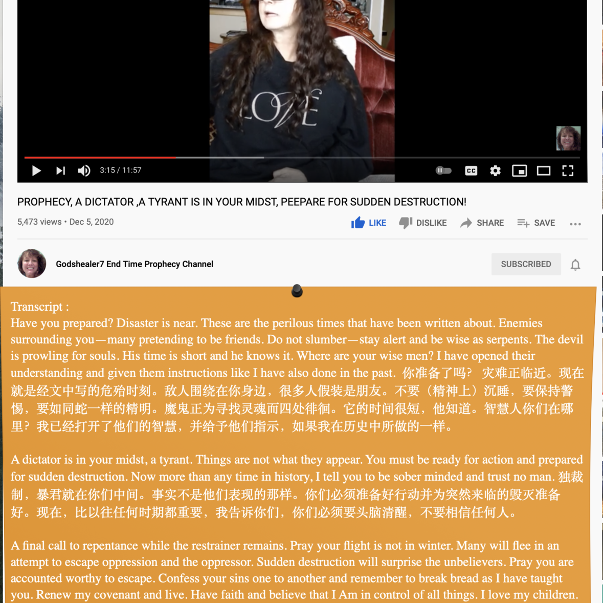 (翻译)准备好!一场大地震正要来到你的城市,你的国家,你的人民!是突然来到的毁灭!准备好!大地将会变废墟,无法辨认。混乱将会发生。大地会颤抖。你将会颤抖。你已经被警告过了!准备好!混乱和骚动在你的城市。你的政府将会控制你生活的每个方面。军法将会公布。你将会生活在一个警察国家里。暴动者将在眼前被枪杀。不会有时间开庭审判。秩序将被建立,异议人士将被移除。准备好!突然来临的毁灭!现在就走向我!忏悔!