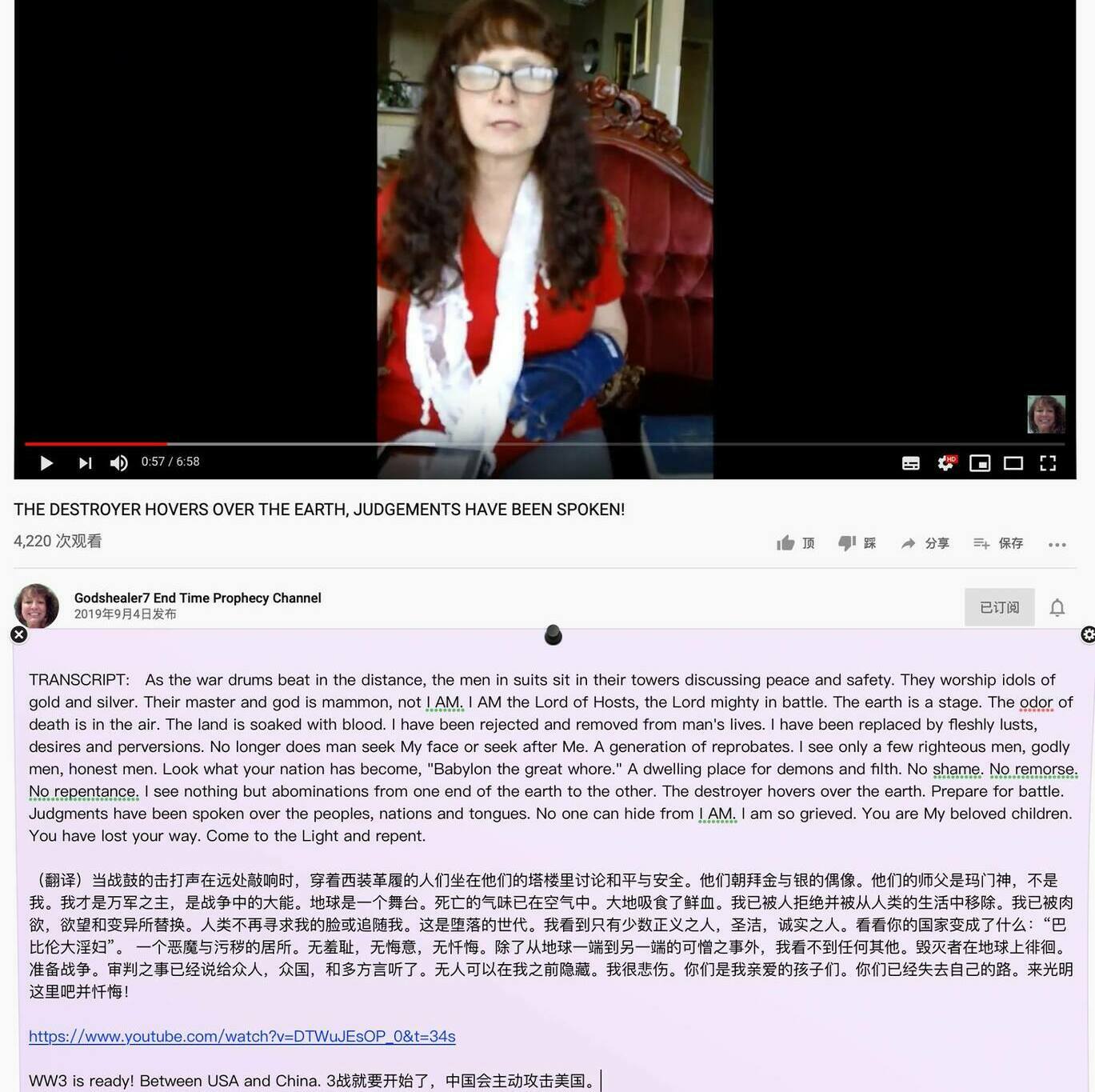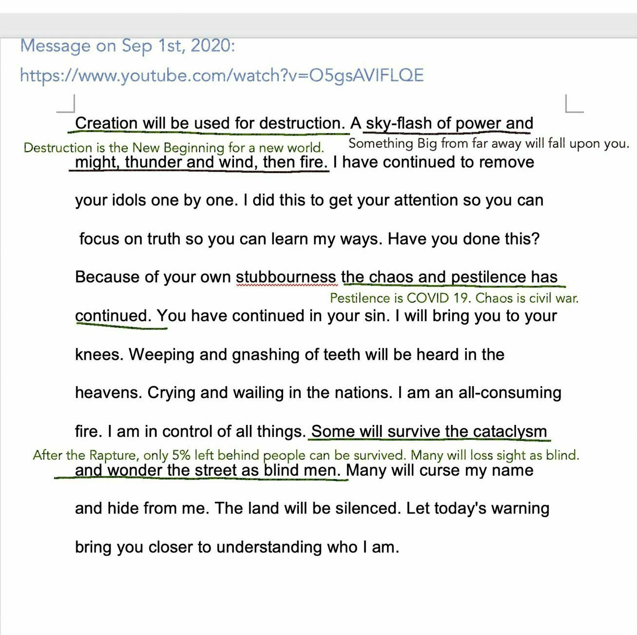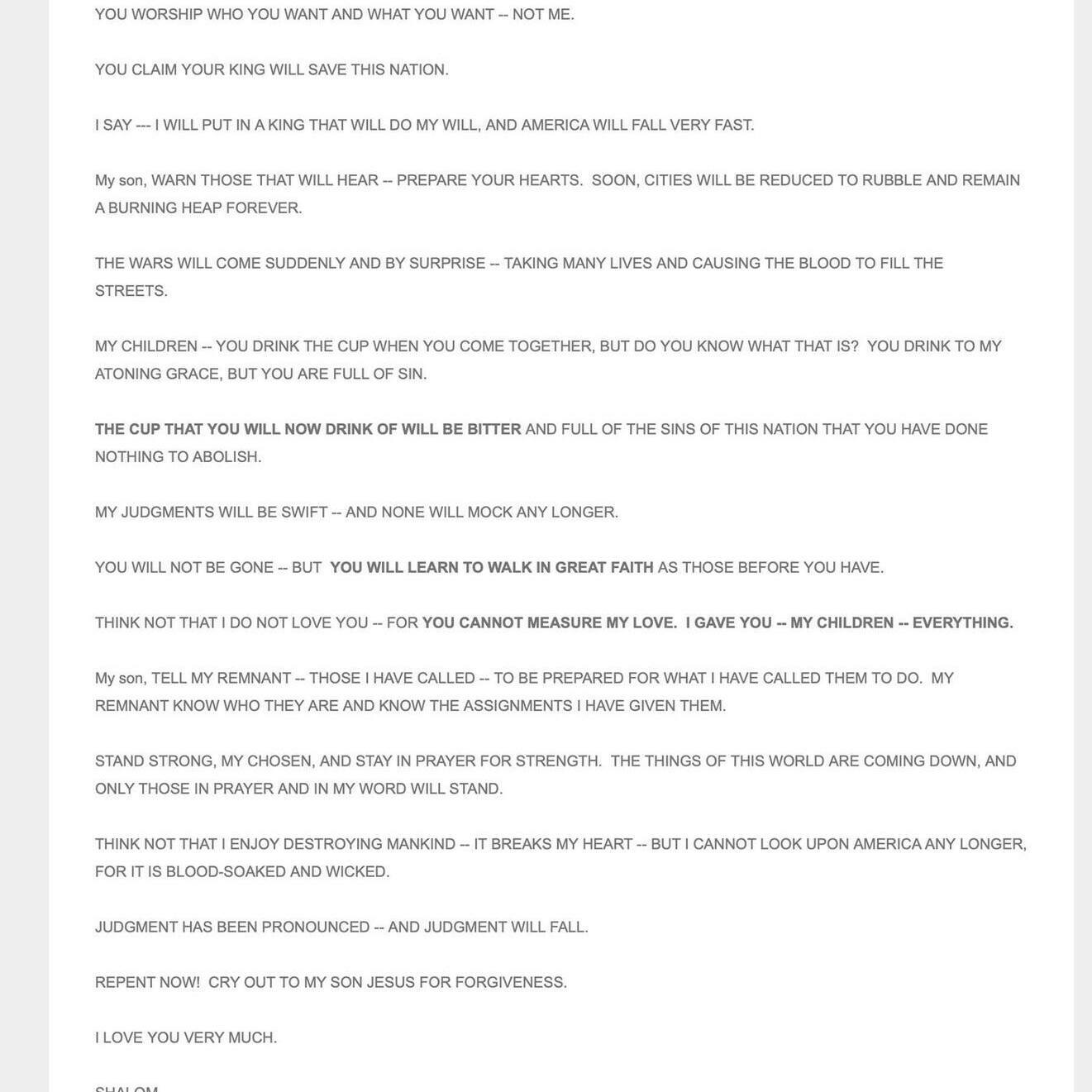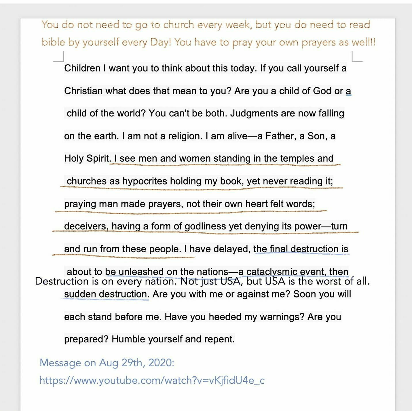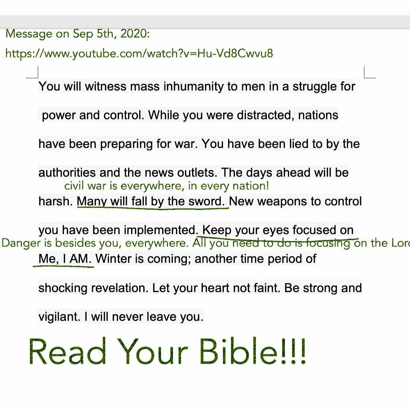 翻译:女儿,毁灭正降临你的国家(美国)。毁灭来自内部的军队。他国的军队也会同时入侵。你骄傲懒惰的人民会成为俘虏和奴隶。你的王(川普)会陷入危机。再次,不忏悔的傲慢的领导者们会因刀剑摔倒。自大在摔倒之前。一个没有为战争准备好的人民和国家会在大街上哭泣和哀嚎。饥荒会席卷地球。更多的瘟疫和烈火将清理一个邪恶和放荡的腐烂地球。你们没有谦卑的来到我面前。我会在摔倒之前发送地震。我会丢弃每一个偶像。我会闭上每个亵渎我名的嘴。我是。 现在你们的领导者们正对你们计划完全的控制,并正在安装工具来寻找查询你们的所在地。我看到很多人正在准备中,如同我告诉你们的。