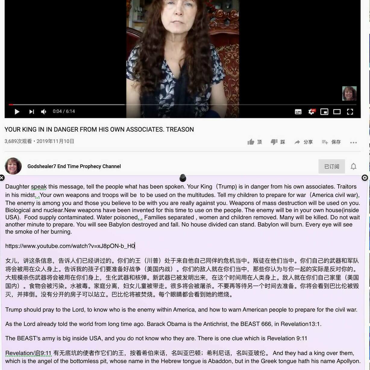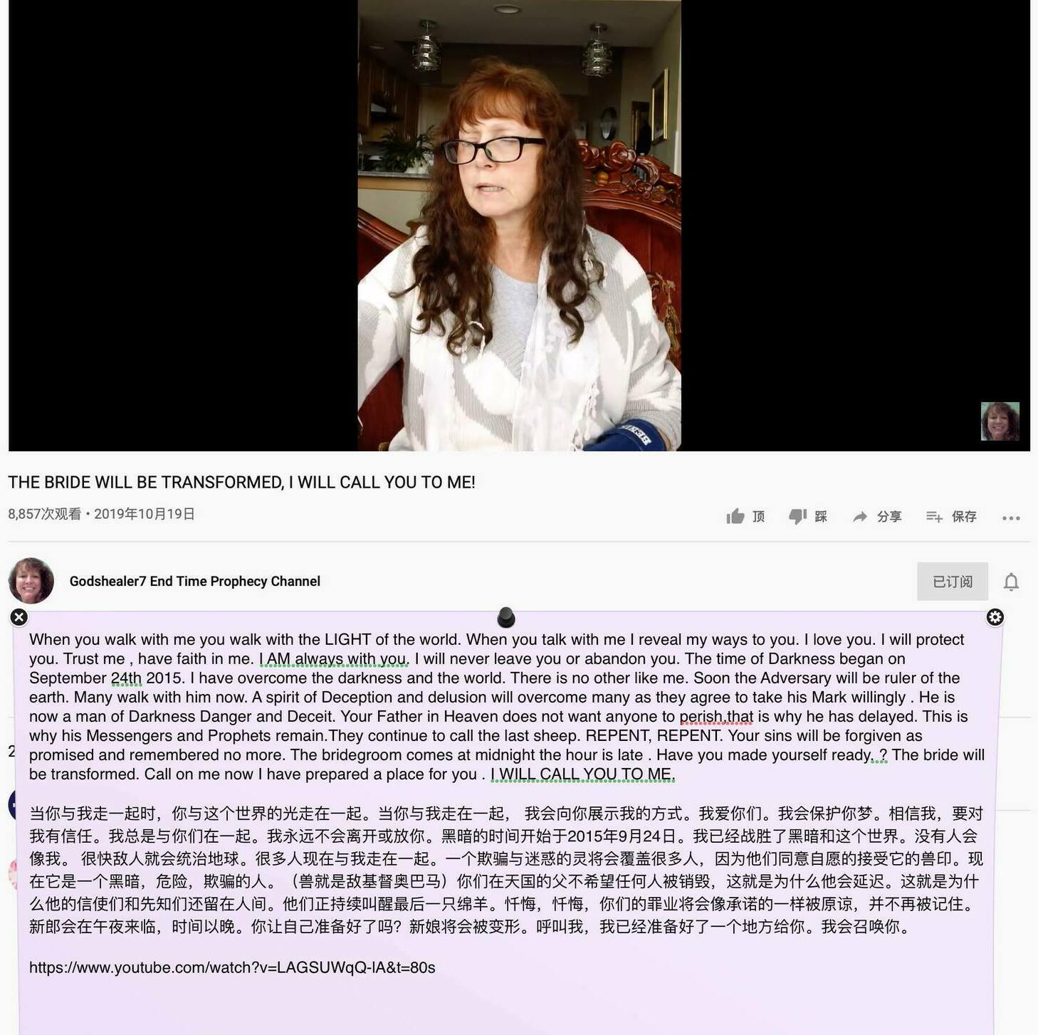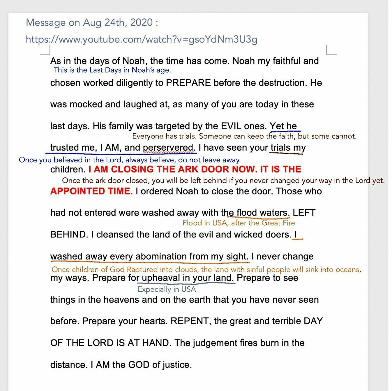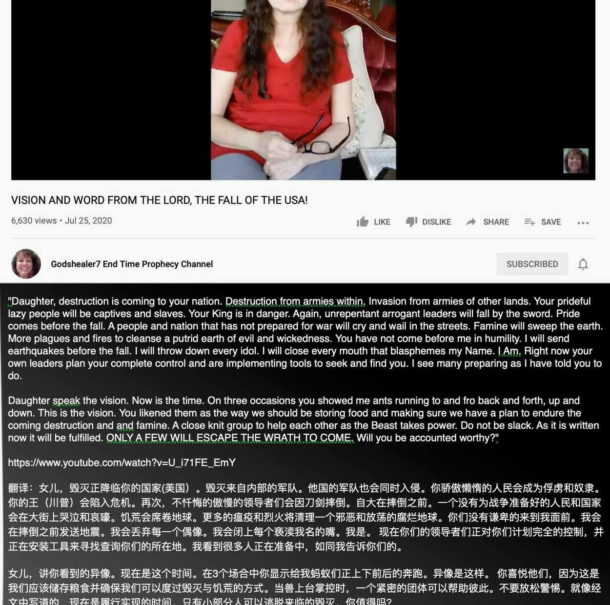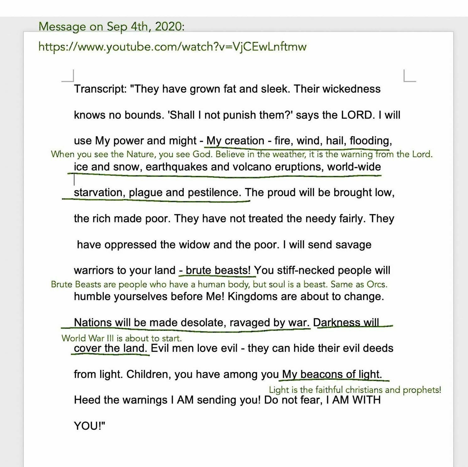 翻译:女儿,毁灭正降临你的国家(美国)。毁灭来自内部的军队。他国的军队也会同时入侵。你骄傲懒惰的人民会成为俘虏和奴隶。你的王(川普)会陷入危机。再次,不忏悔的傲慢的领导者们会因刀剑摔倒。自大在摔倒之前。一个没有为战争准备好的人民和国家会在大街上哭泣和哀嚎。饥荒会席卷地球。更多的瘟疫和烈火将清理一个邪恶和放荡的腐烂地球。你们没有谦卑的来到我面前。我会在摔倒之前发送地震。我会丢弃每一个偶像。我会闭上每个亵渎我名的嘴。我是。 现在你们的领导者们正对你们计划完全的控制,并正在安装工具来寻找查询你们的所在地。我看到很多人正在准备中,如同我告诉你们的。