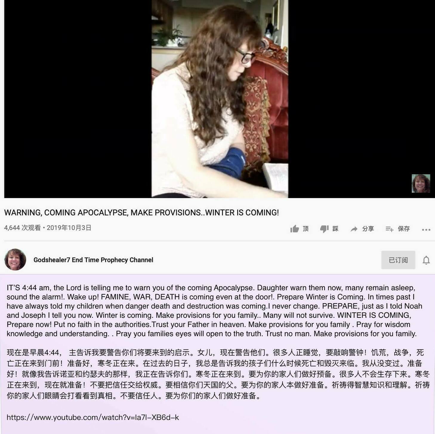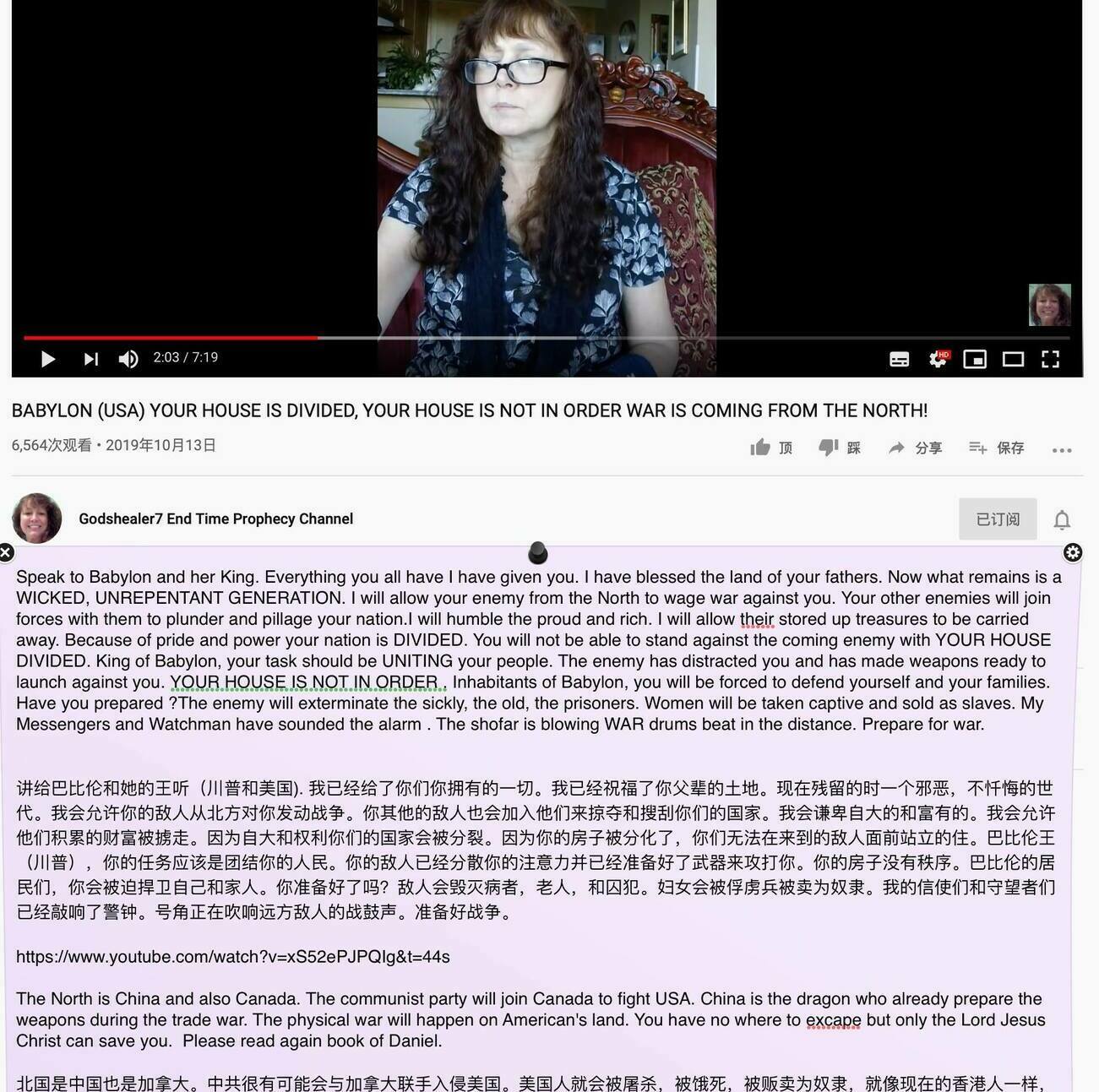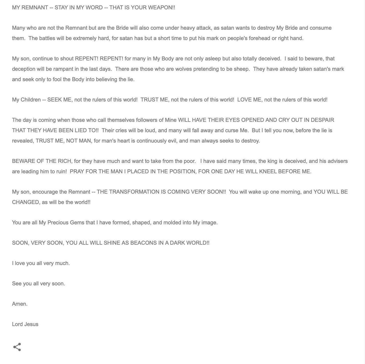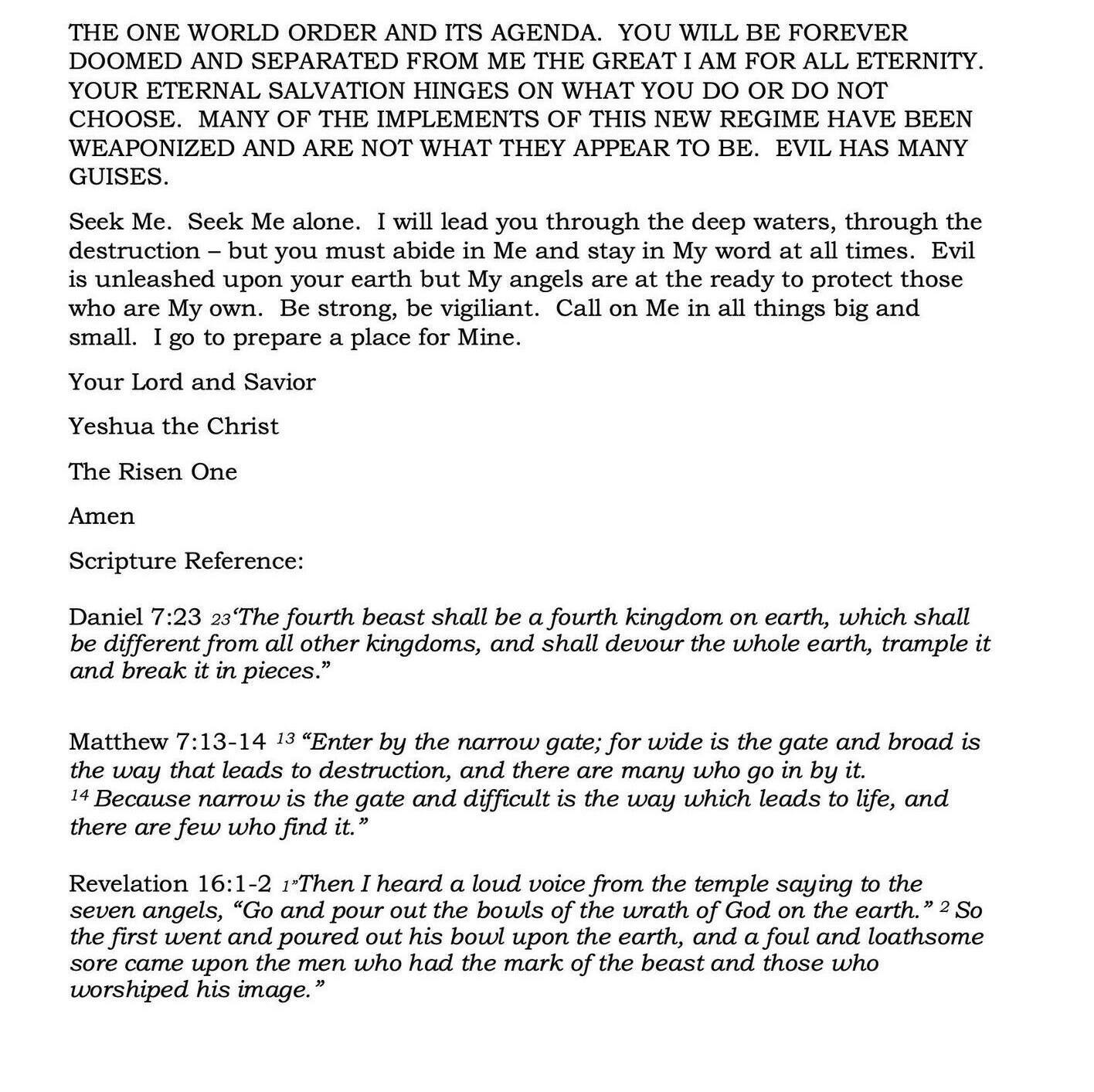 翻译:女儿,毁灭正降临你的国家(美国)。毁灭来自内部的军队。他国的军队也会同时入侵。你骄傲懒惰的人民会成为俘虏和奴隶。你的王(川普)会陷入危机。再次,不忏悔的傲慢的领导者们会因刀剑摔倒。自大在摔倒之前。一个没有为战争准备好的人民和国家会在大街上哭泣和哀嚎。饥荒会席卷地球。更多的瘟疫和烈火将清理一个邪恶和放荡的腐烂地球。你们没有谦卑的来到我面前。我会在摔倒之前发送地震。我会丢弃每一个偶像。我会闭上每个亵渎我名的嘴。我是。 现在你们的领导者们正对你们计划完全的控制,并正在安装工具来寻找查询你们的所在地。我看到很多人正在准备中,如同我告诉你们的。