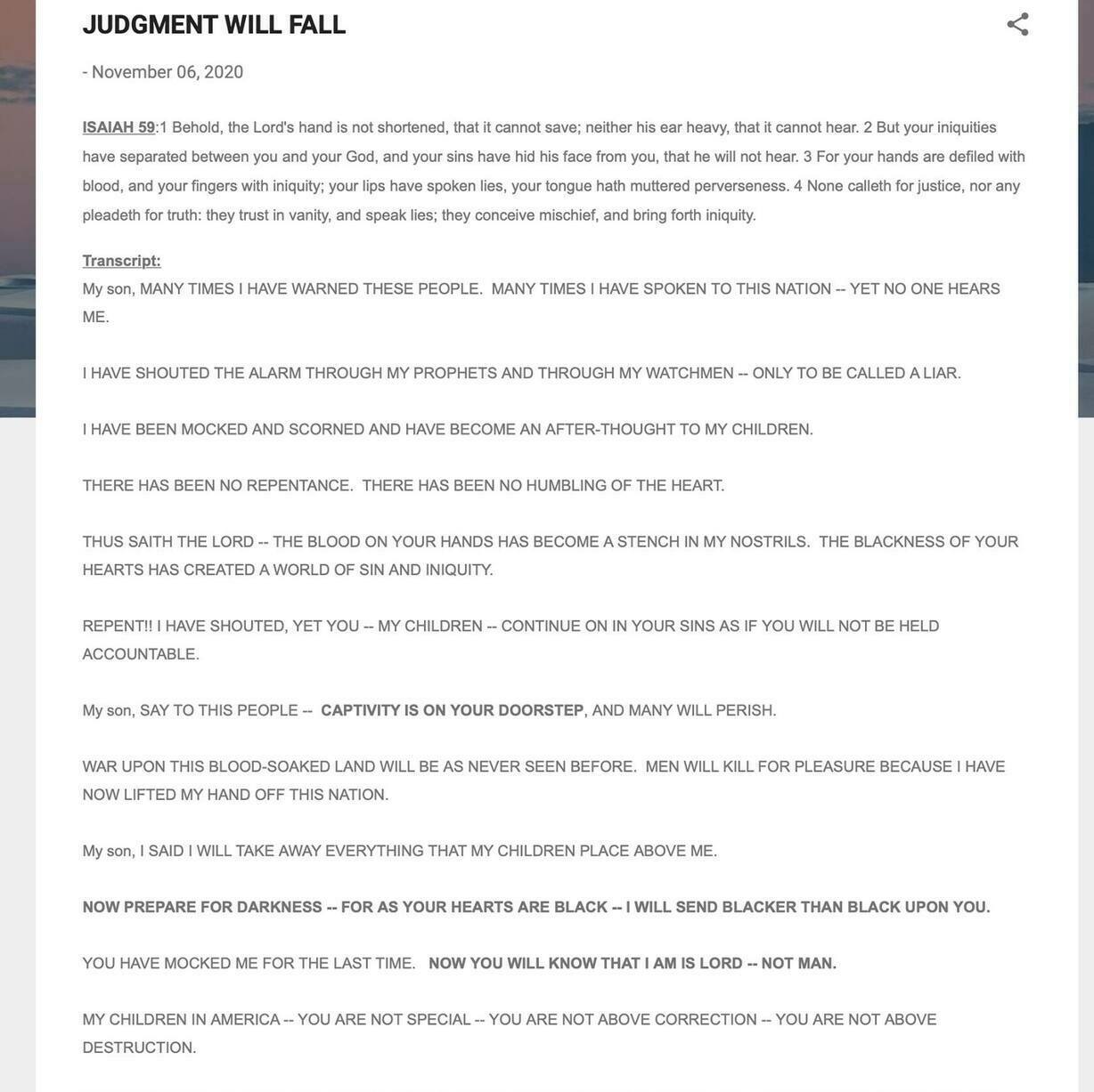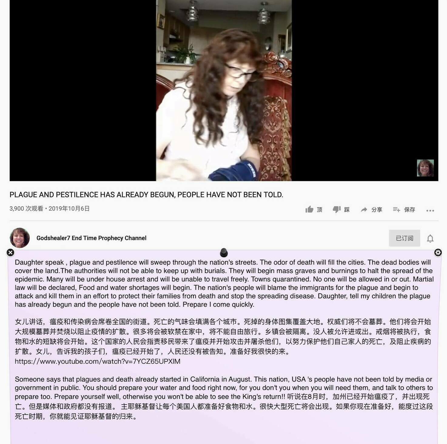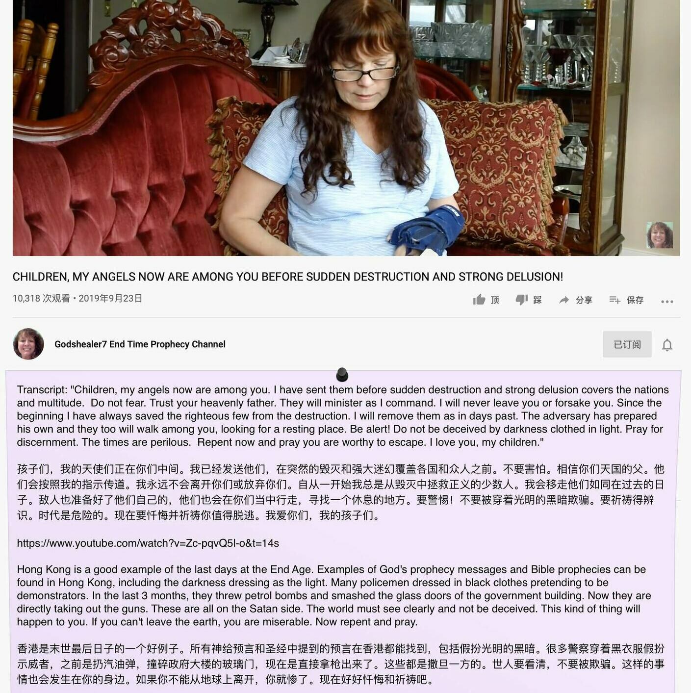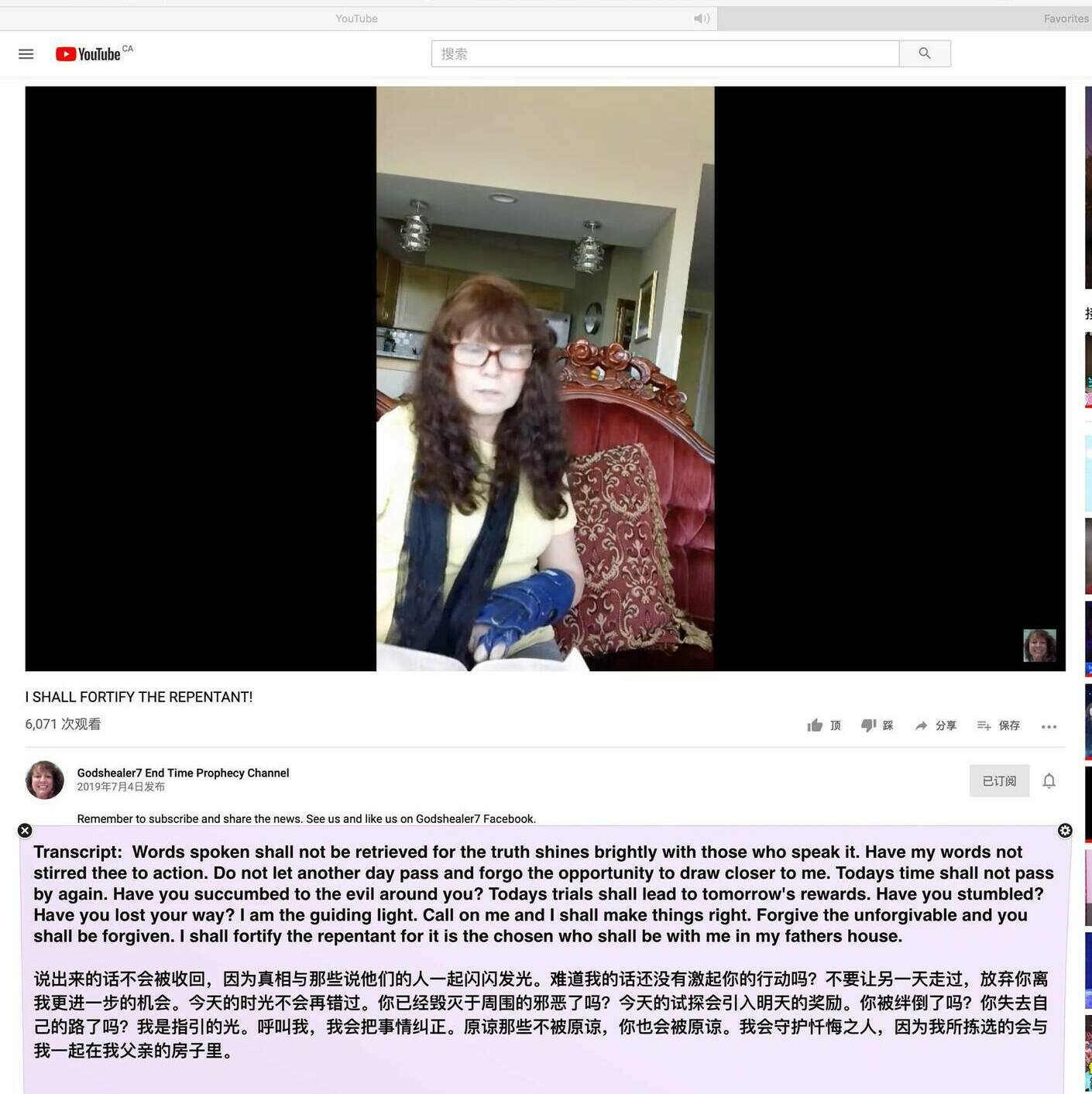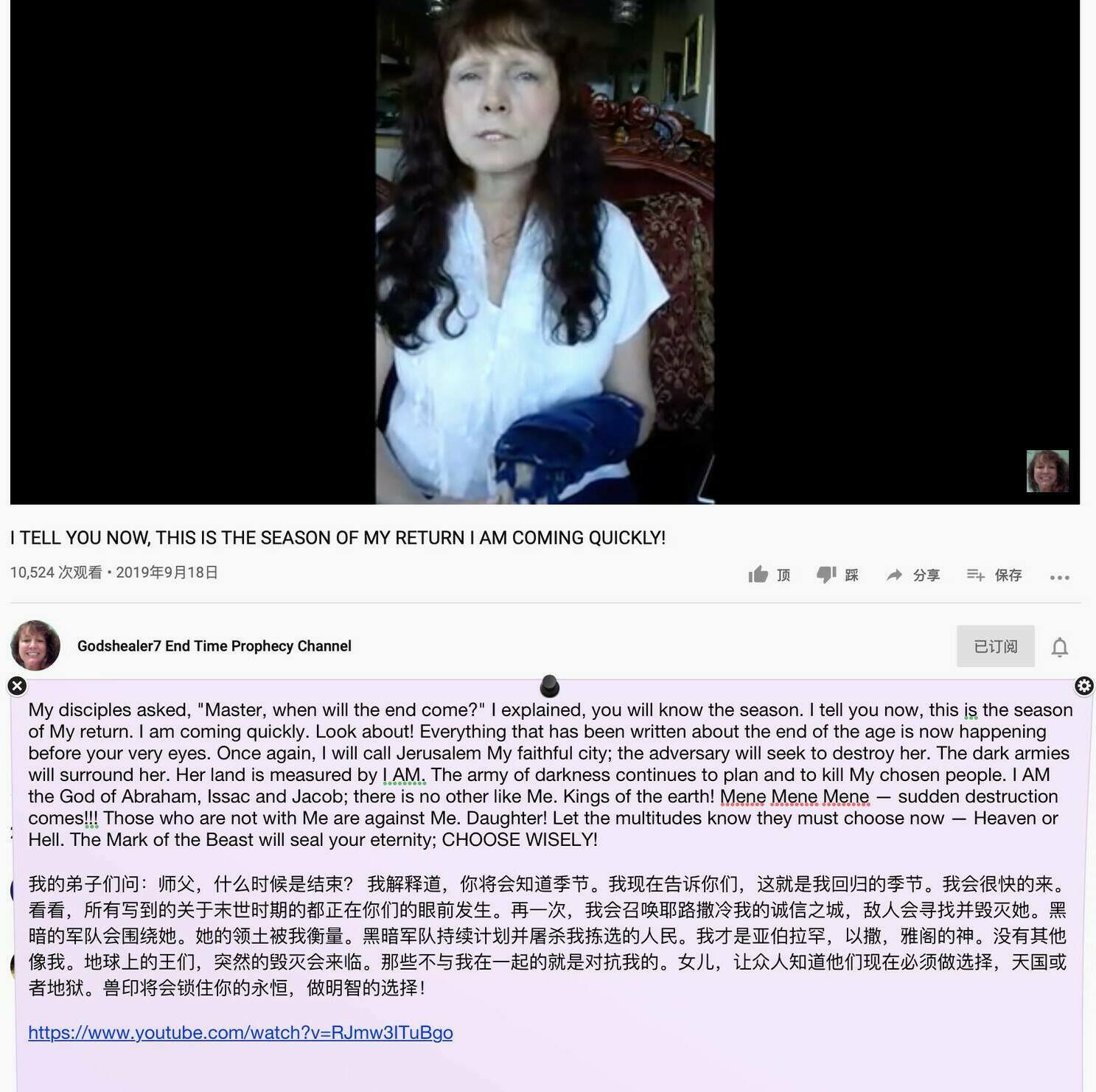 翻译:女儿,毁灭正降临你的国家(美国)。毁灭来自内部的军队。他国的军队也会同时入侵。你骄傲懒惰的人民会成为俘虏和奴隶。你的王(川普)会陷入危机。再次,不忏悔的傲慢的领导者们会因刀剑摔倒。自大在摔倒之前。一个没有为战争准备好的人民和国家会在大街上哭泣和哀嚎。饥荒会席卷地球。更多的瘟疫和烈火将清理一个邪恶和放荡的腐烂地球。你们没有谦卑的来到我面前。我会在摔倒之前发送地震。我会丢弃每一个偶像。我会闭上每个亵渎我名的嘴。我是。 现在你们的领导者们正对你们计划完全的控制,并正在安装工具来寻找查询你们的所在地。我看到很多人正在准备中,如同我告诉你们的。