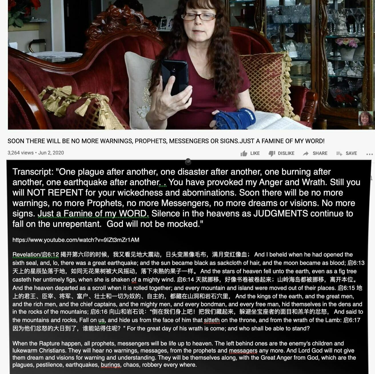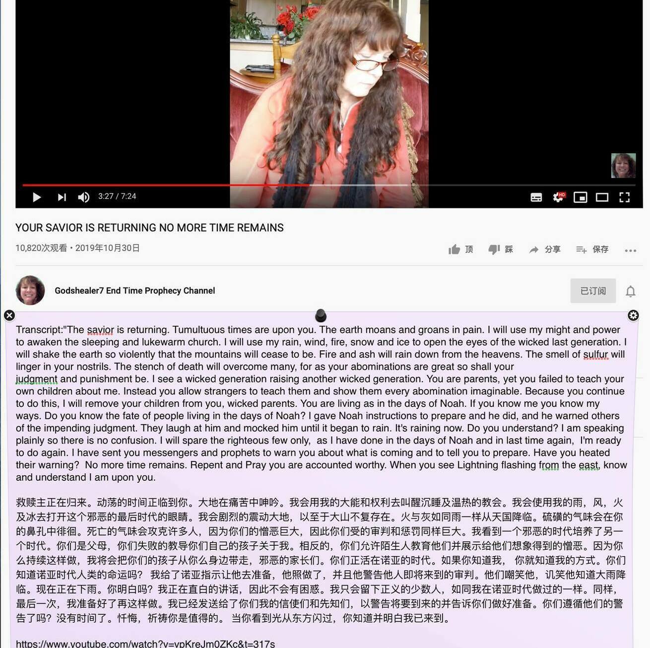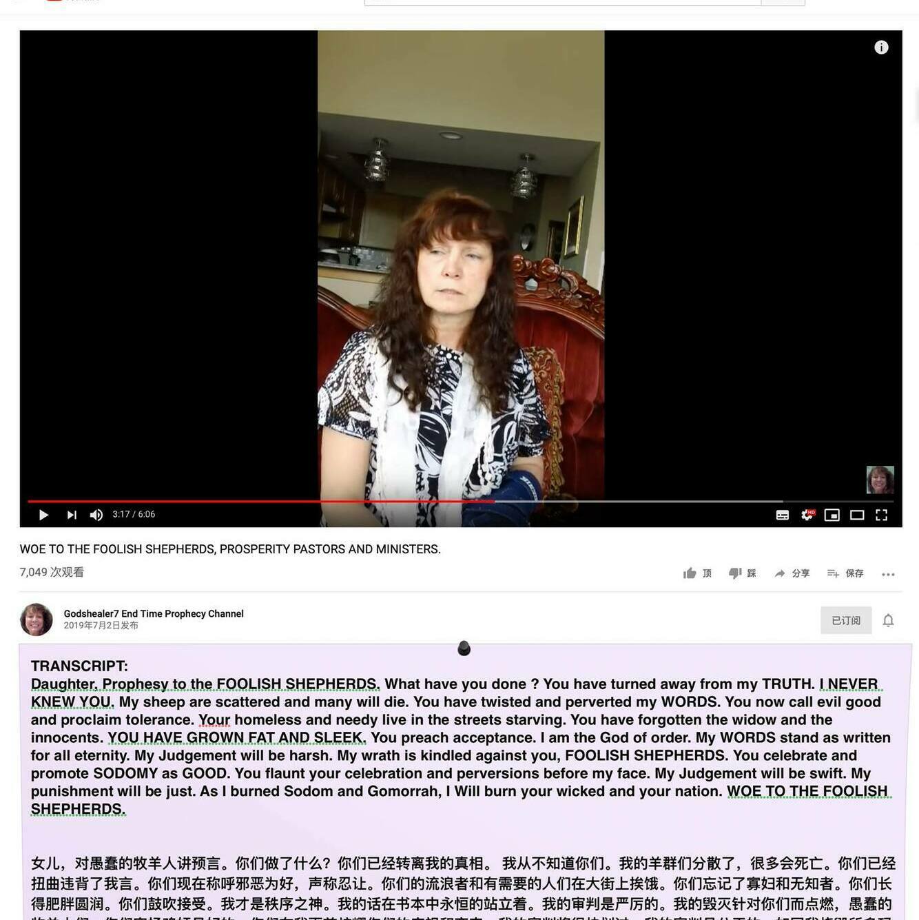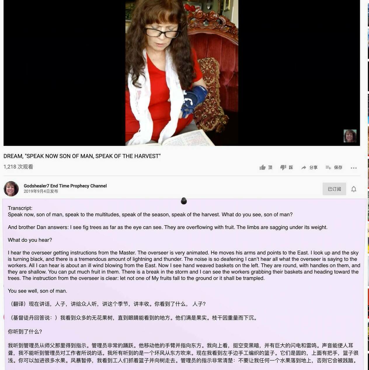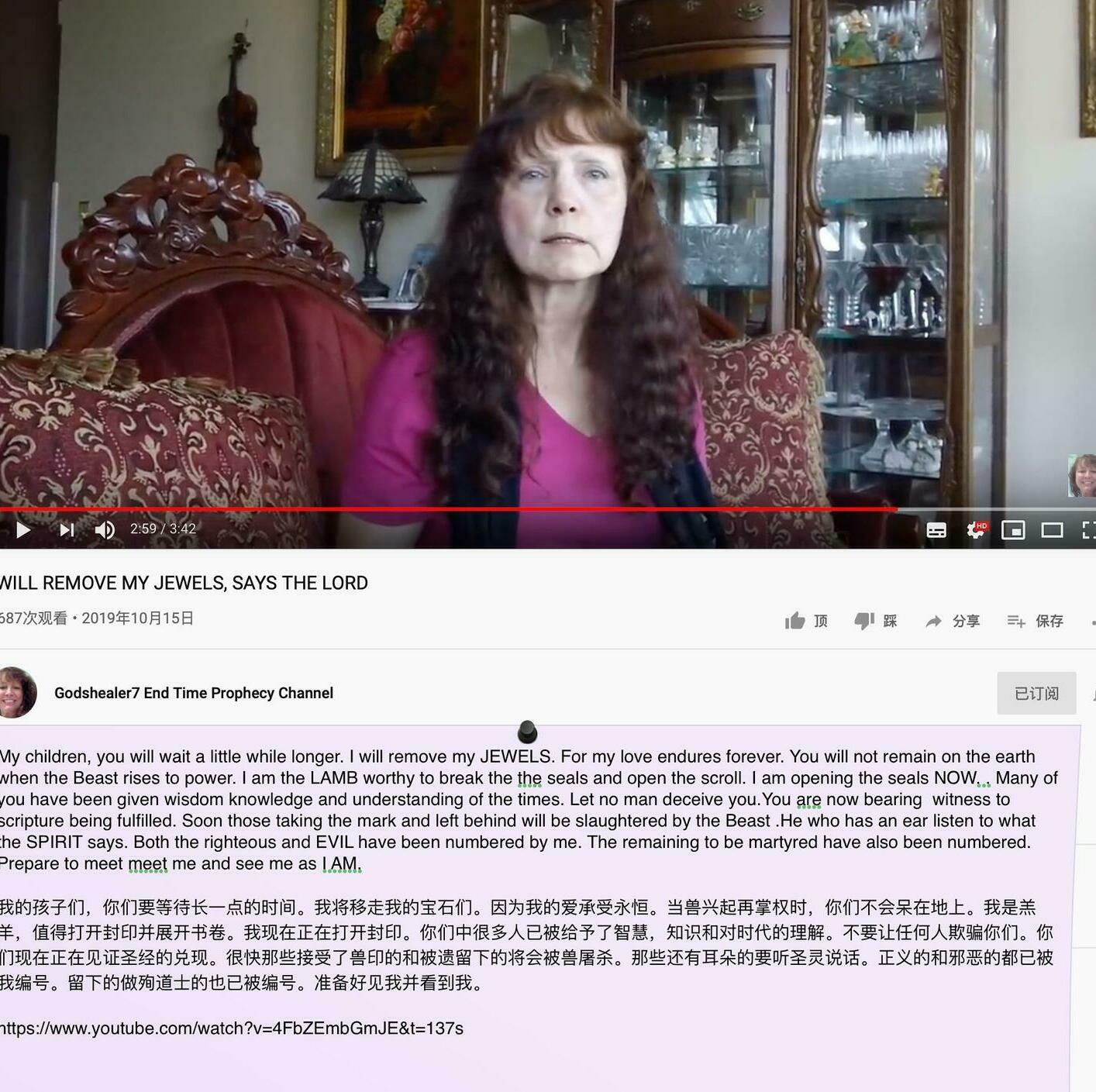 翻译:女儿,毁灭正降临你的国家(美国)。毁灭来自内部的军队。他国的军队也会同时入侵。你骄傲懒惰的人民会成为俘虏和奴隶。你的王(川普)会陷入危机。再次,不忏悔的傲慢的领导者们会因刀剑摔倒。自大在摔倒之前。一个没有为战争准备好的人民和国家会在大街上哭泣和哀嚎。饥荒会席卷地球。更多的瘟疫和烈火将清理一个邪恶和放荡的腐烂地球。你们没有谦卑的来到我面前。我会在摔倒之前发送地震。我会丢弃每一个偶像。我会闭上每个亵渎我名的嘴。我是。 现在你们的领导者们正对你们计划完全的控制,并正在安装工具来寻找查询你们的所在地。我看到很多人正在准备中,如同我告诉你们的。