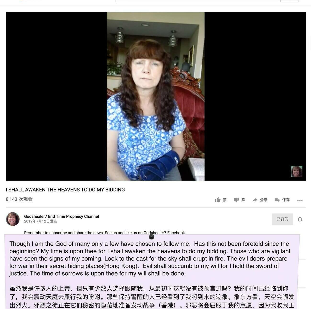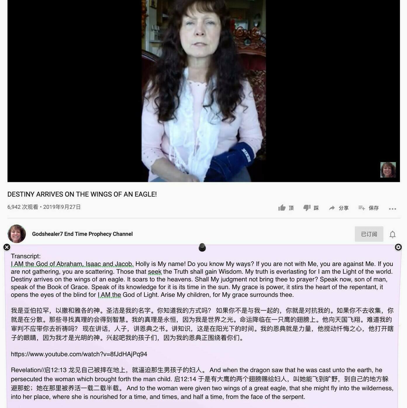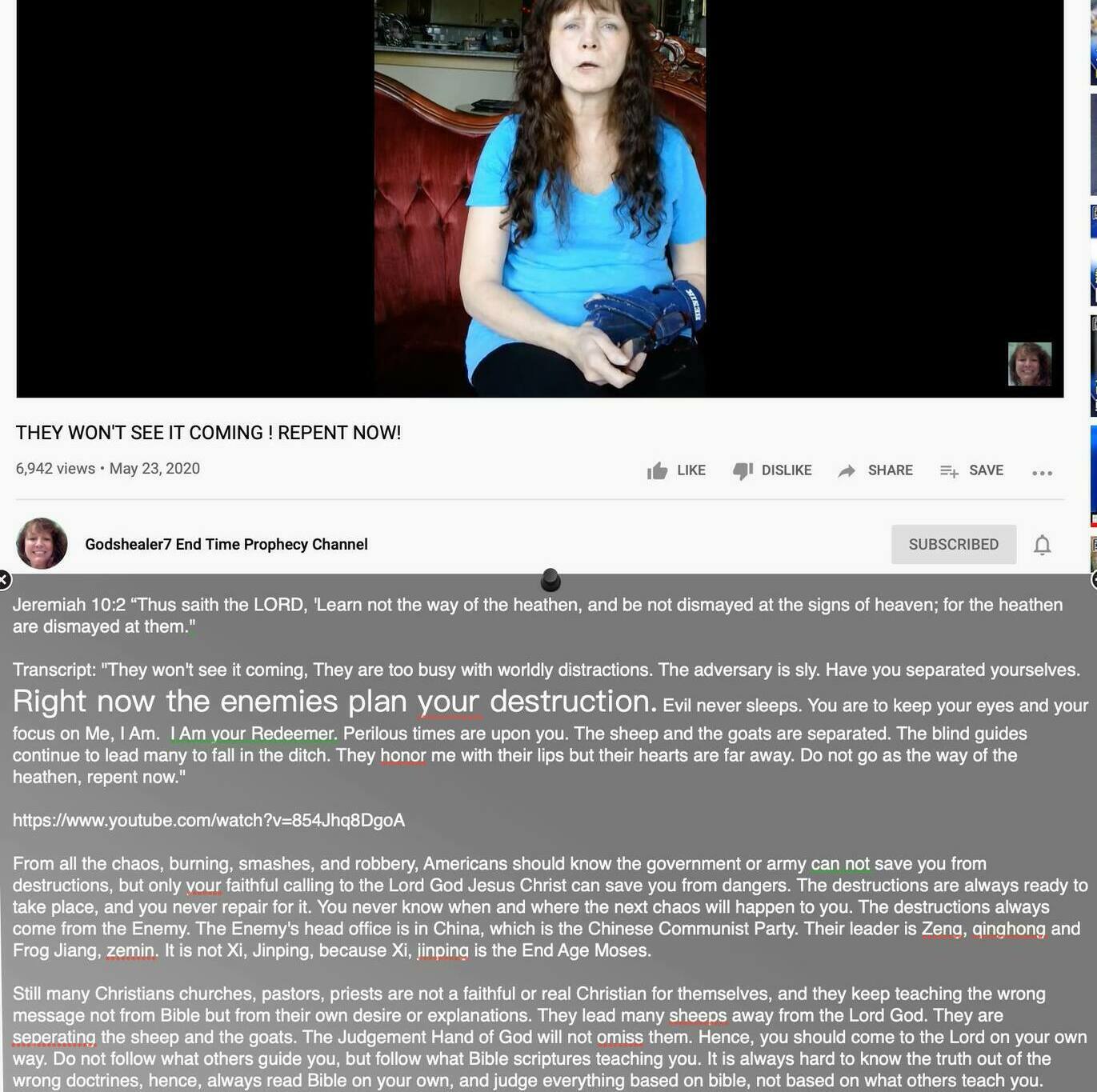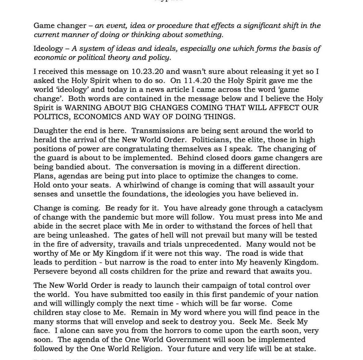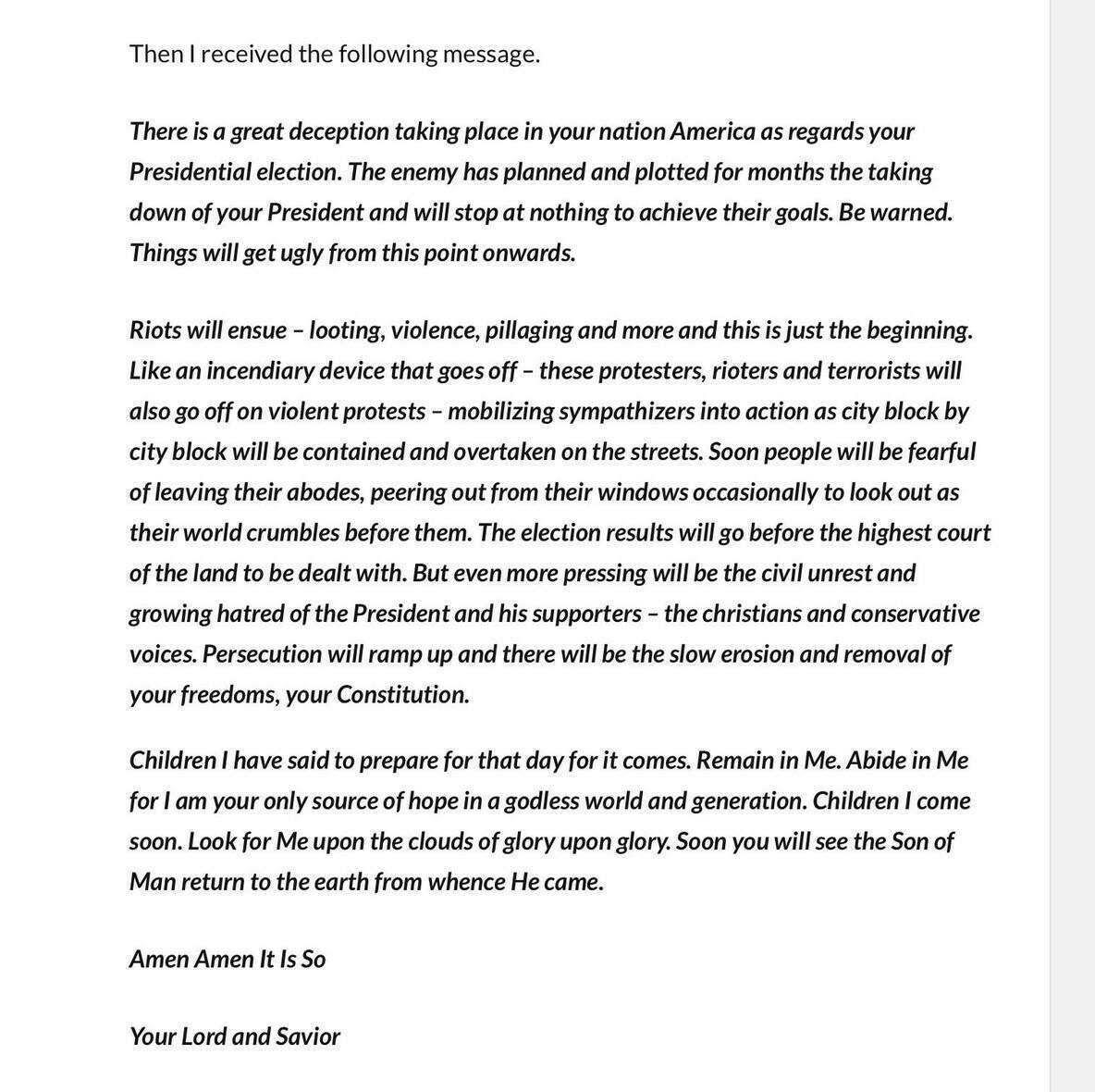 翻译:女儿,毁灭正降临你的国家(美国)。毁灭来自内部的军队。他国的军队也会同时入侵。你骄傲懒惰的人民会成为俘虏和奴隶。你的王(川普)会陷入危机。再次,不忏悔的傲慢的领导者们会因刀剑摔倒。自大在摔倒之前。一个没有为战争准备好的人民和国家会在大街上哭泣和哀嚎。饥荒会席卷地球。更多的瘟疫和烈火将清理一个邪恶和放荡的腐烂地球。你们没有谦卑的来到我面前。我会在摔倒之前发送地震。我会丢弃每一个偶像。我会闭上每个亵渎我名的嘴。我是。 现在你们的领导者们正对你们计划完全的控制,并正在安装工具来寻找查询你们的所在地。我看到很多人正在准备中,如同我告诉你们的。