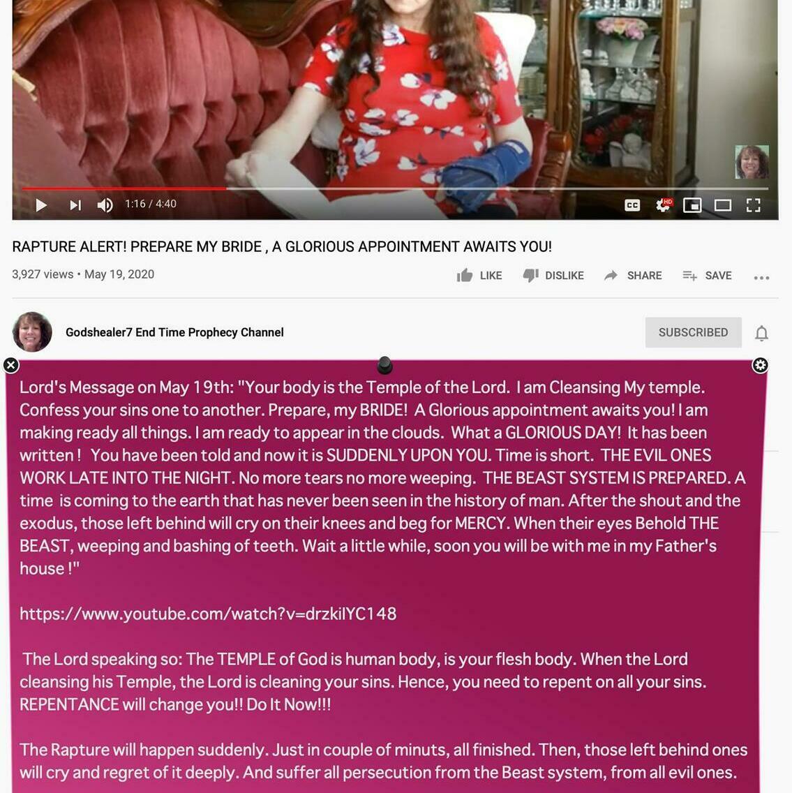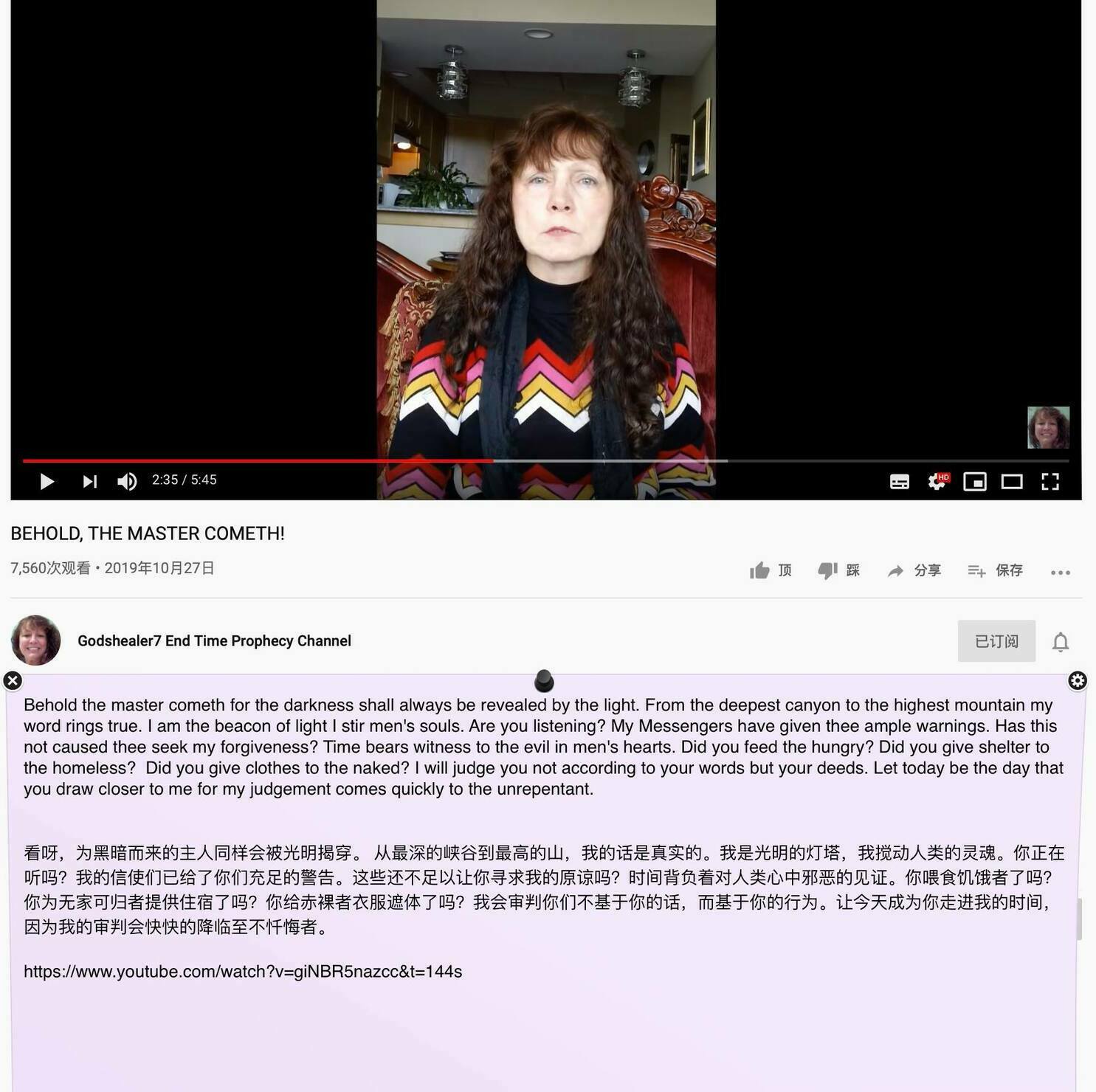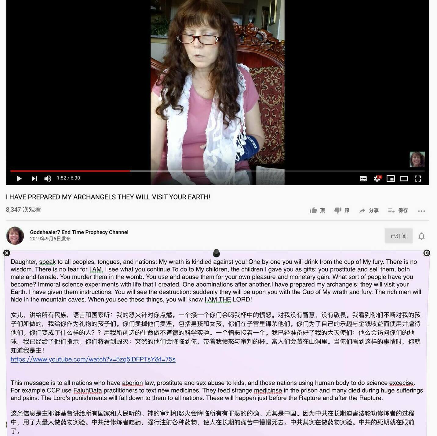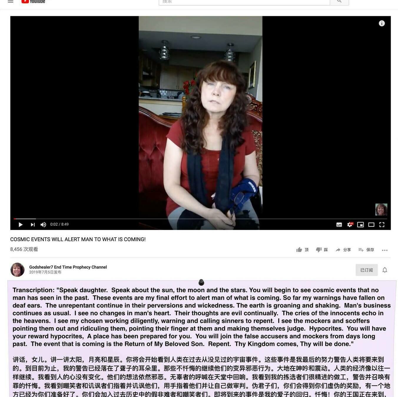 翻译:女儿,毁灭正降临你的国家(美国)。毁灭来自内部的军队。他国的军队也会同时入侵。你骄傲懒惰的人民会成为俘虏和奴隶。你的王(川普)会陷入危机。再次,不忏悔的傲慢的领导者们会因刀剑摔倒。自大在摔倒之前。一个没有为战争准备好的人民和国家会在大街上哭泣和哀嚎。饥荒会席卷地球。更多的瘟疫和烈火将清理一个邪恶和放荡的腐烂地球。你们没有谦卑的来到我面前。我会在摔倒之前发送地震。我会丢弃每一个偶像。我会闭上每个亵渎我名的嘴。我是。 现在你们的领导者们正对你们计划完全的控制,并正在安装工具来寻找查询你们的所在地。我看到很多人正在准备中,如同我告诉你们的。