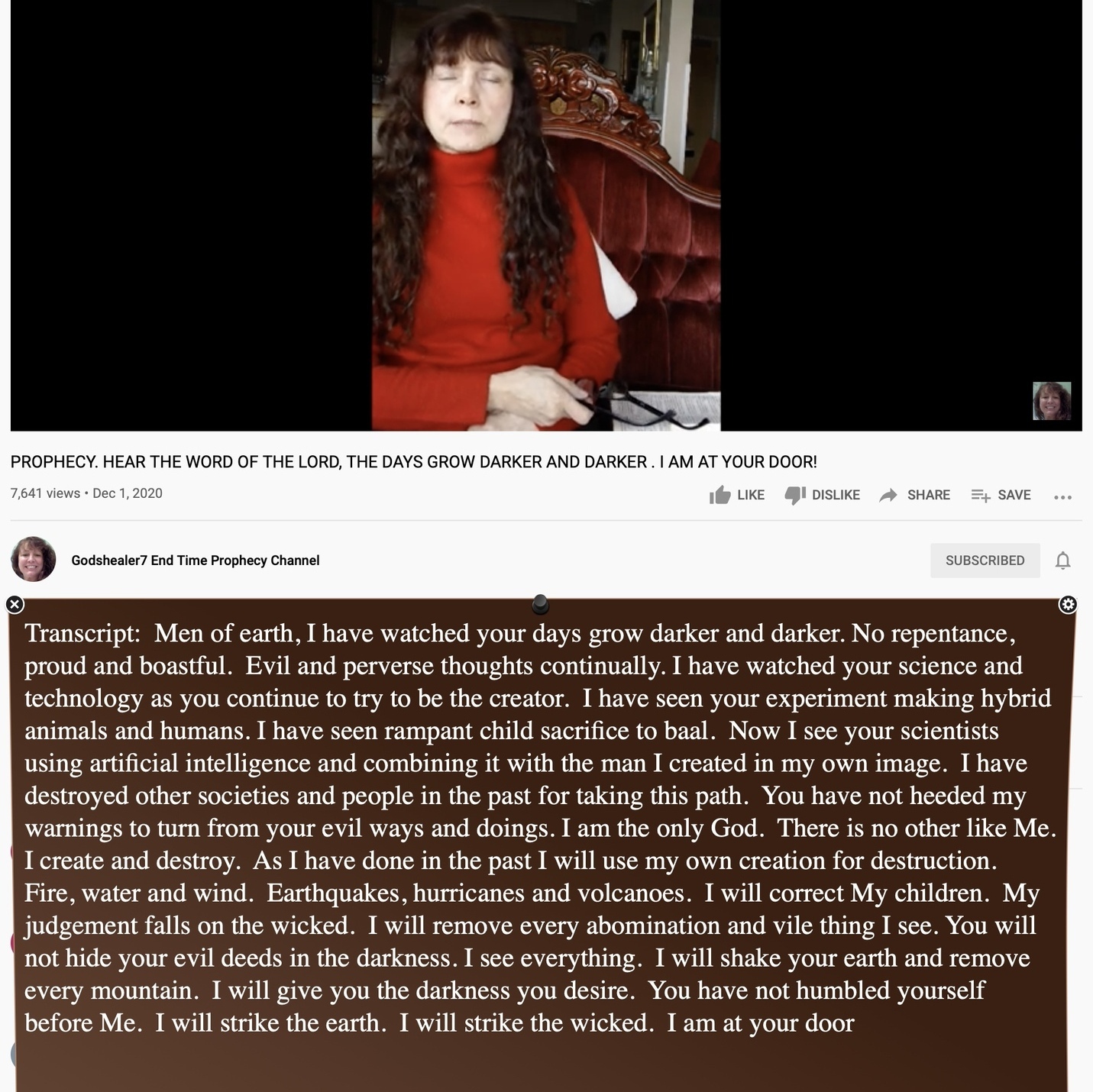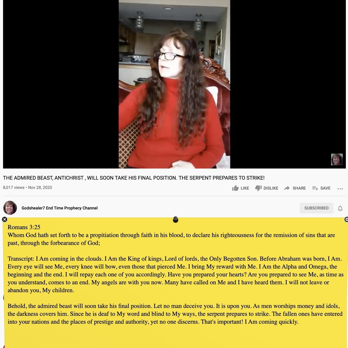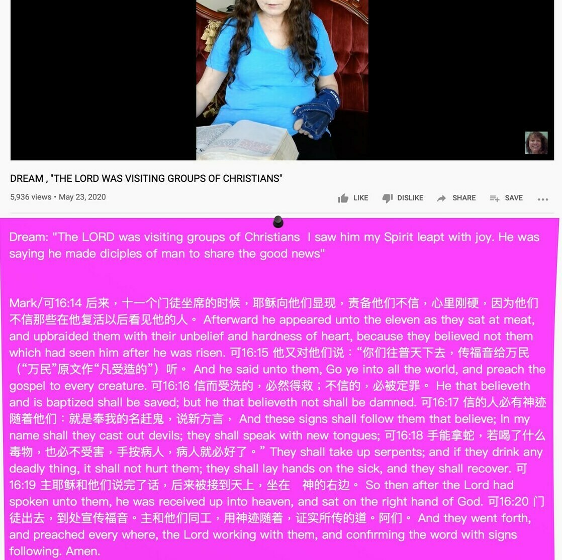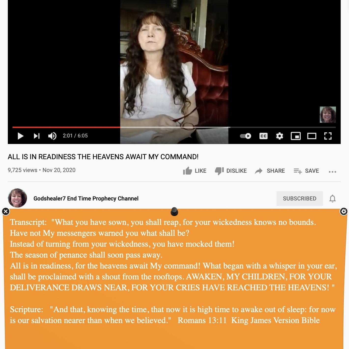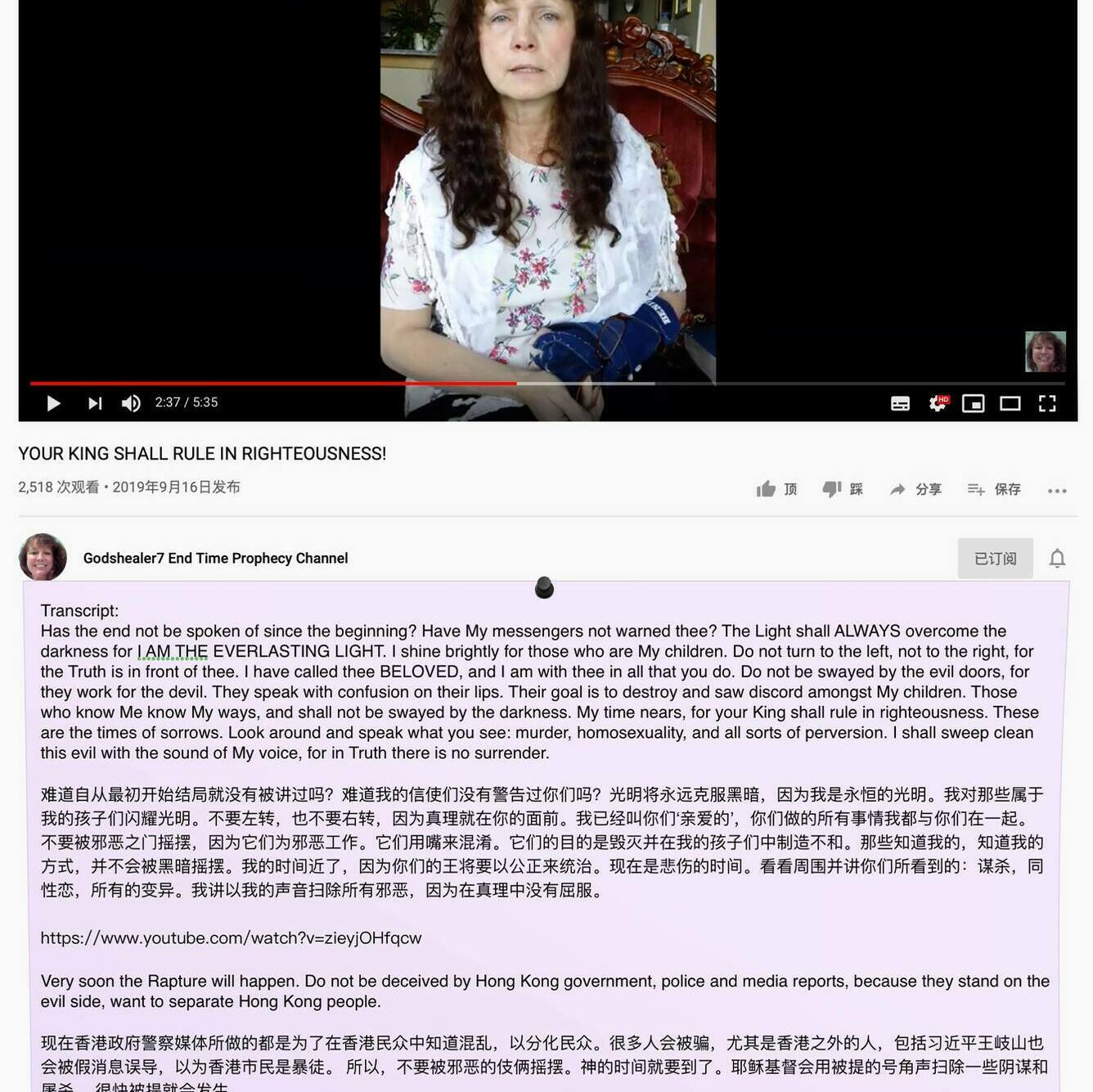 翻译:女儿,毁灭正降临你的国家(美国)。毁灭来自内部的军队。他国的军队也会同时入侵。你骄傲懒惰的人民会成为俘虏和奴隶。你的王(川普)会陷入危机。再次,不忏悔的傲慢的领导者们会因刀剑摔倒。自大在摔倒之前。一个没有为战争准备好的人民和国家会在大街上哭泣和哀嚎。饥荒会席卷地球。更多的瘟疫和烈火将清理一个邪恶和放荡的腐烂地球。你们没有谦卑的来到我面前。我会在摔倒之前发送地震。我会丢弃每一个偶像。我会闭上每个亵渎我名的嘴。我是。 现在你们的领导者们正对你们计划完全的控制,并正在安装工具来寻找查询你们的所在地。我看到很多人正在准备中,如同我告诉你们的。