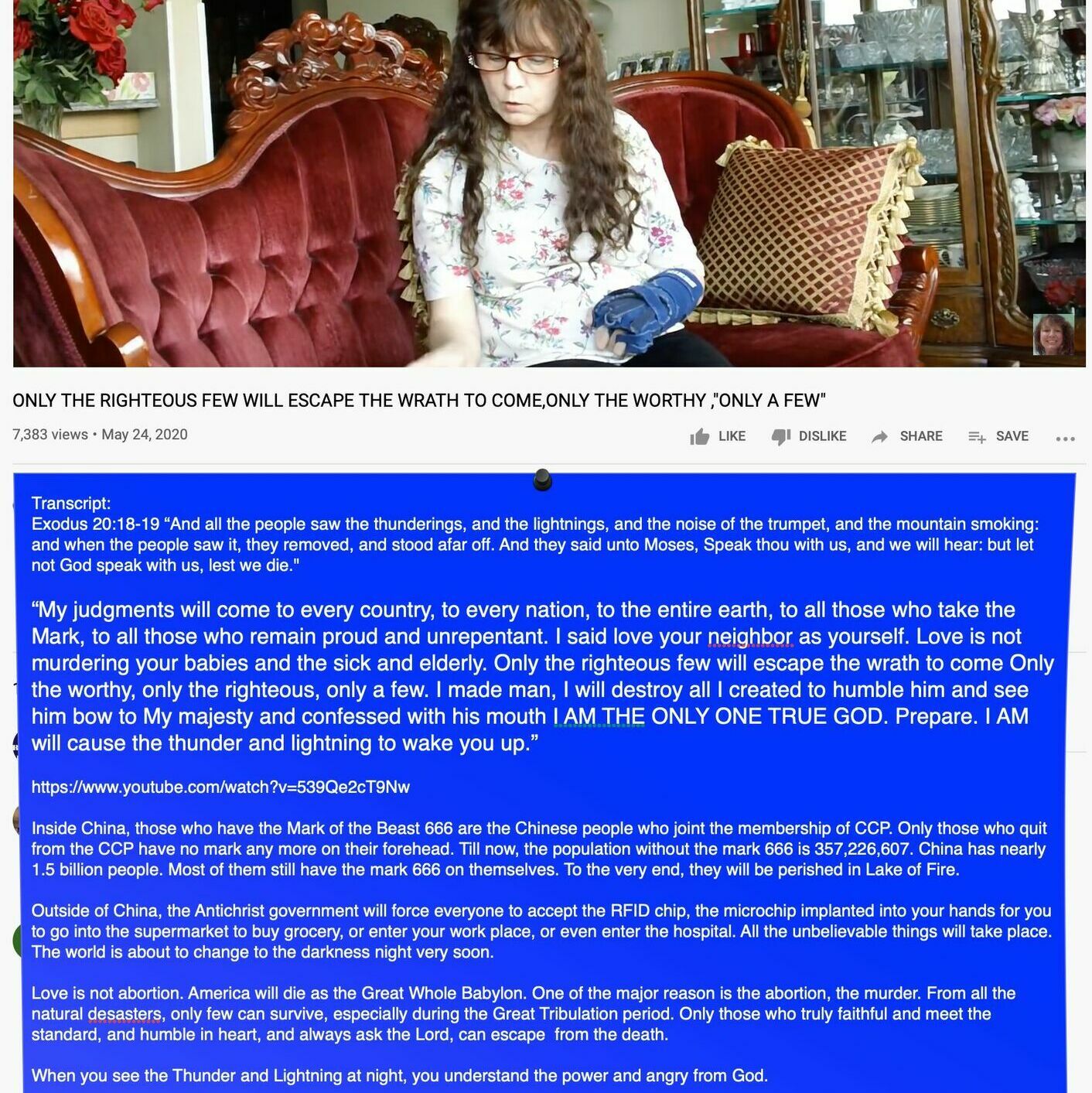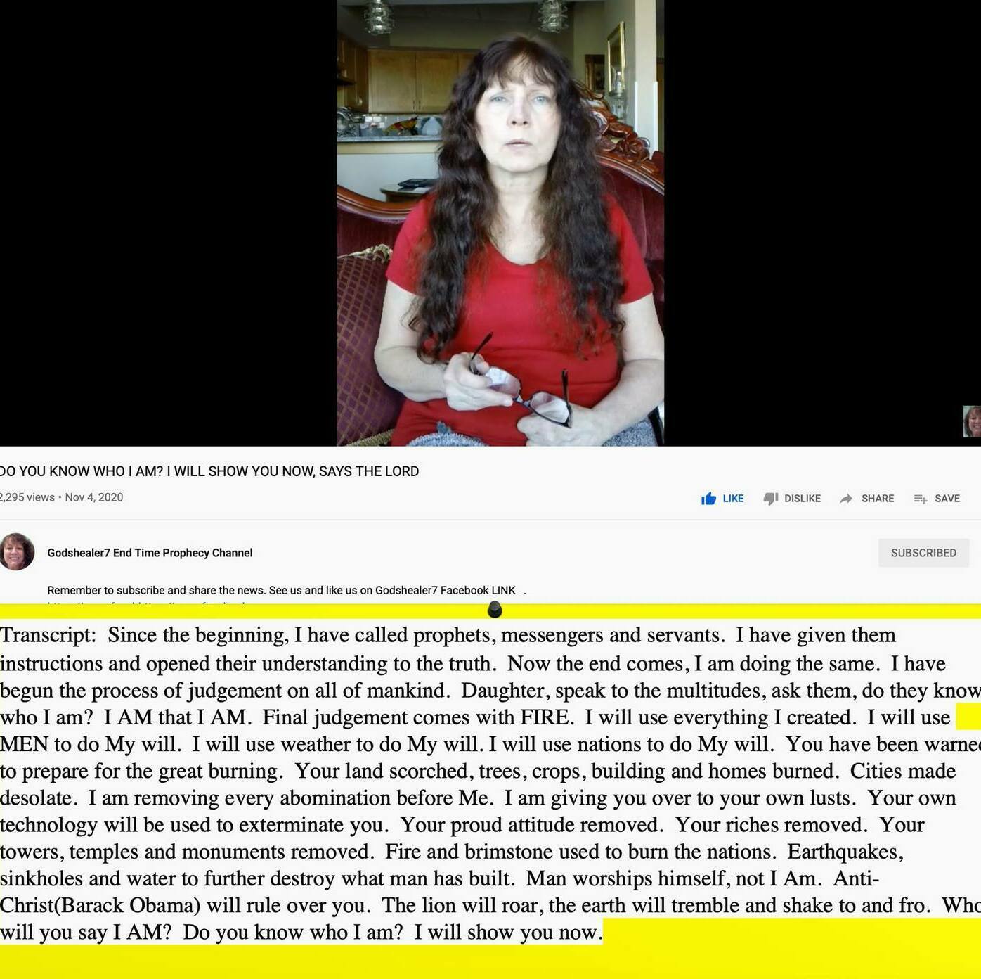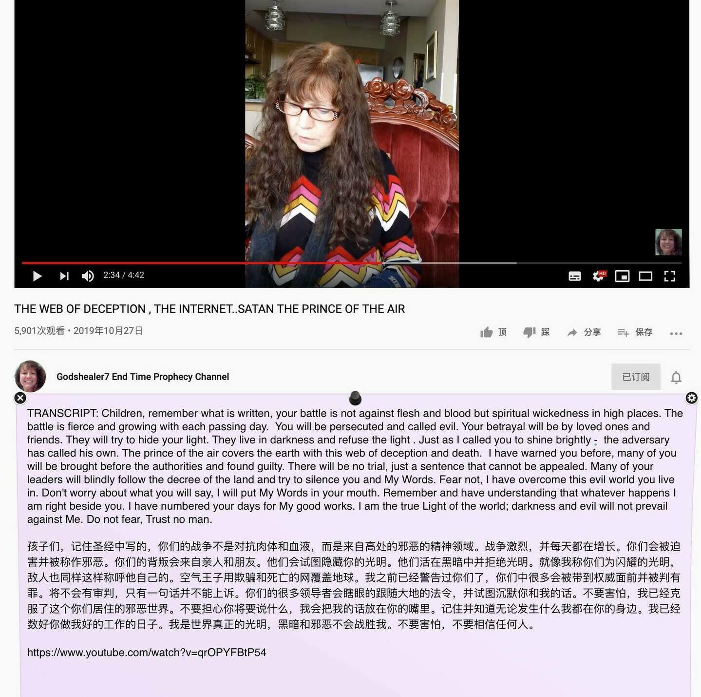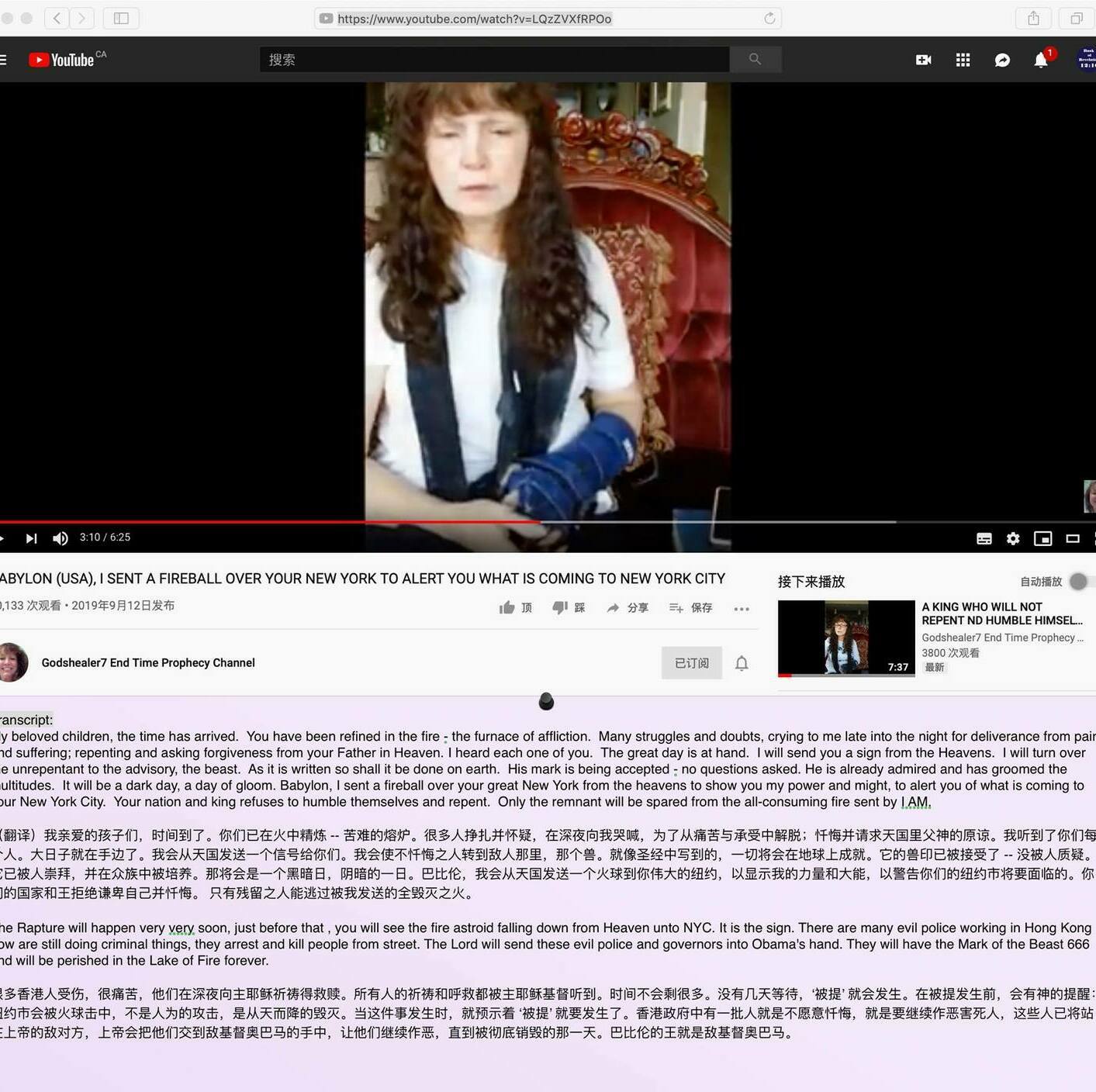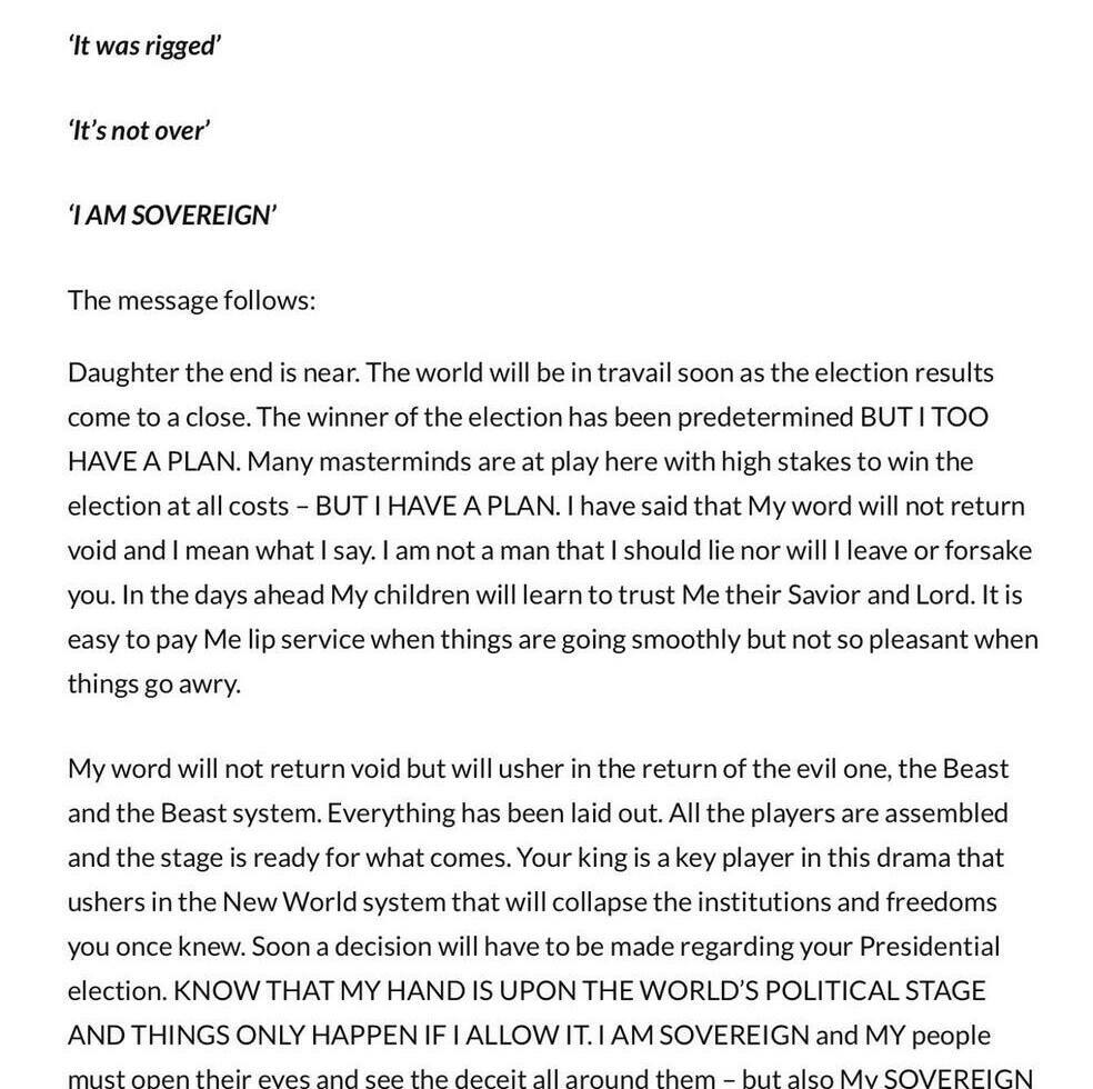 翻译:女儿,毁灭正降临你的国家(美国)。毁灭来自内部的军队。他国的军队也会同时入侵。你骄傲懒惰的人民会成为俘虏和奴隶。你的王(川普)会陷入危机。再次,不忏悔的傲慢的领导者们会因刀剑摔倒。自大在摔倒之前。一个没有为战争准备好的人民和国家会在大街上哭泣和哀嚎。饥荒会席卷地球。更多的瘟疫和烈火将清理一个邪恶和放荡的腐烂地球。你们没有谦卑的来到我面前。我会在摔倒之前发送地震。我会丢弃每一个偶像。我会闭上每个亵渎我名的嘴。我是。 现在你们的领导者们正对你们计划完全的控制,并正在安装工具来寻找查询你们的所在地。我看到很多人正在准备中,如同我告诉你们的。