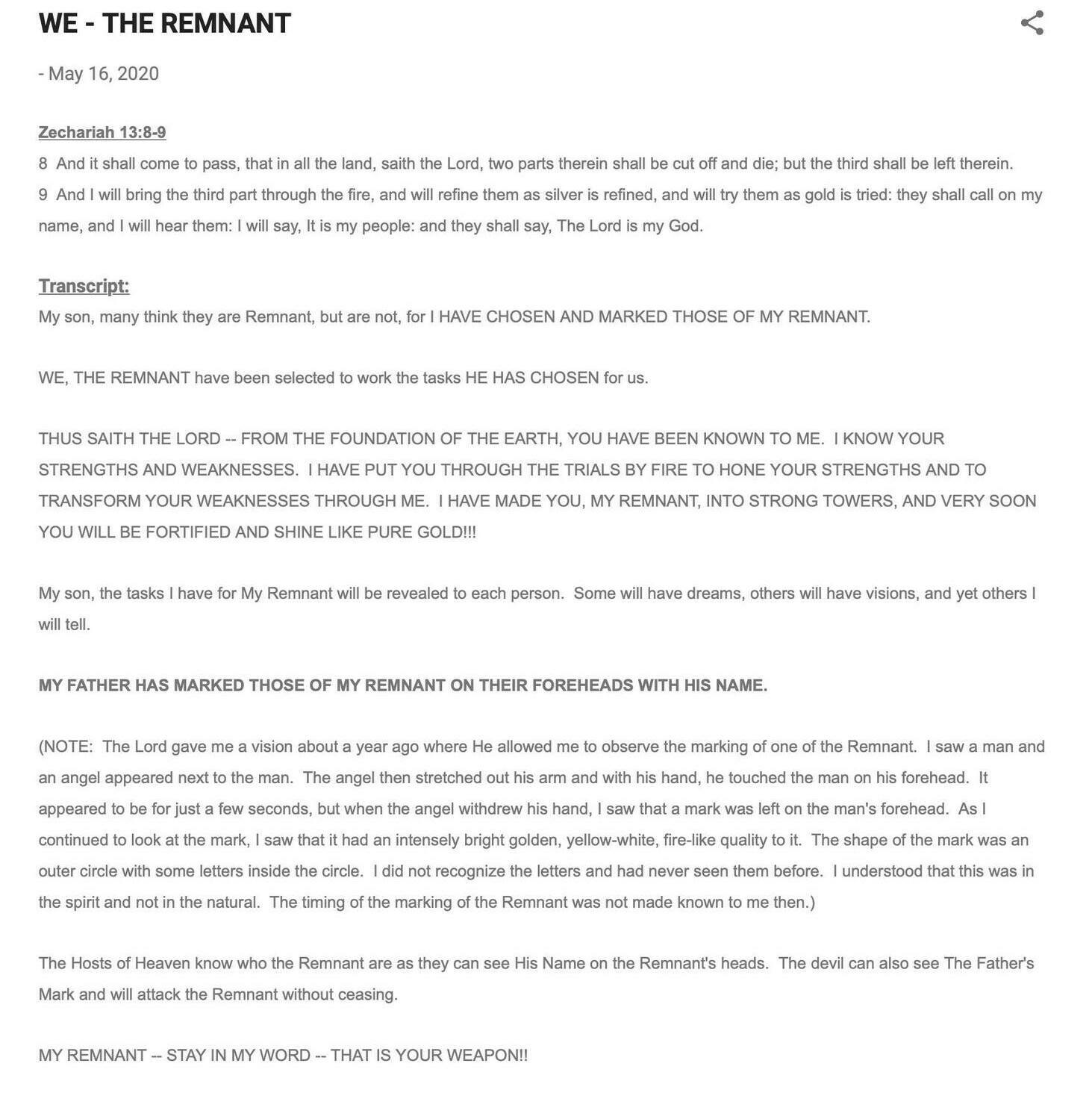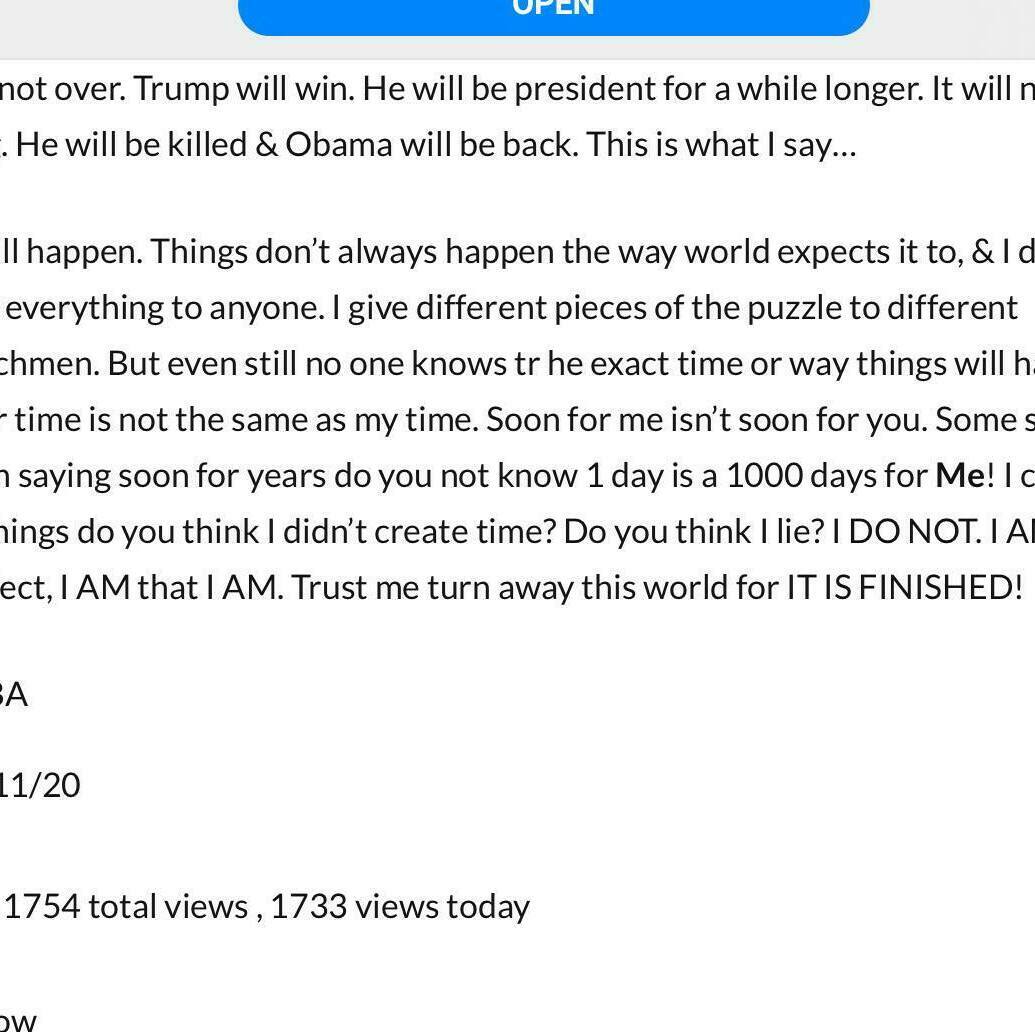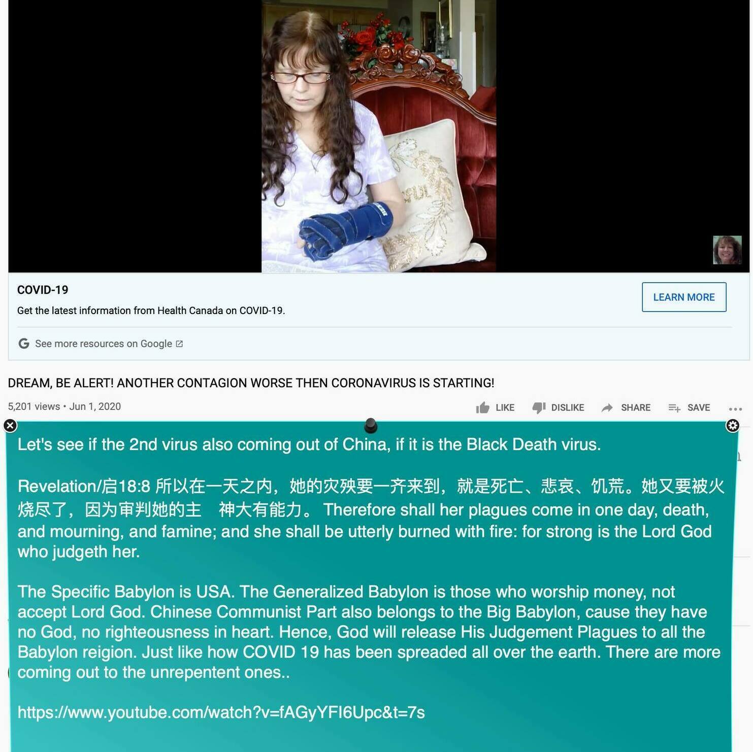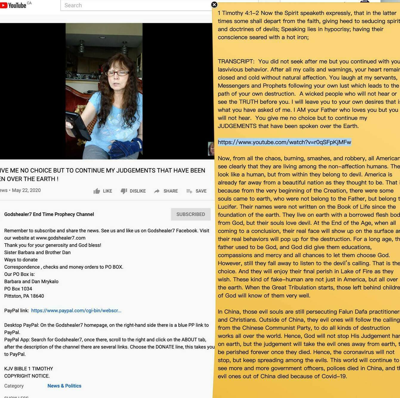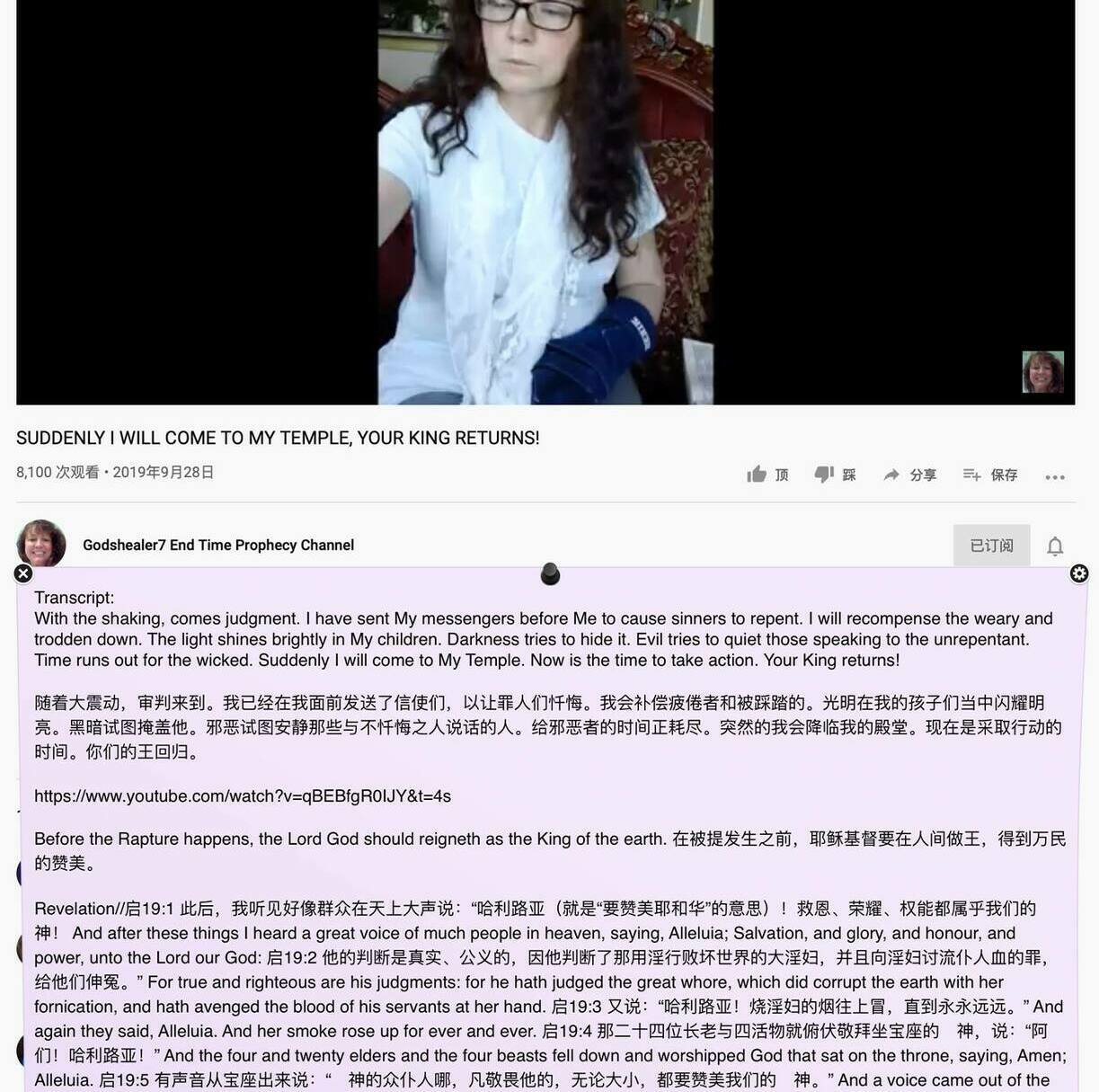翻译:女儿,毁灭正降临你的国家(美国)。毁灭来自内部的军队。他国的军队也会同时入侵。你骄傲懒惰的人民会成为俘虏和奴隶。你的王(川普)会陷入危机。再次,不忏悔的傲慢的领导者们会因刀剑摔倒。自大在摔倒之前。一个没有为战争准备好的人民和国家会在大街上哭泣和哀嚎。饥荒会席卷地球。更多的瘟疫和烈火将清理一个邪恶和放荡的腐烂地球。你们没有谦卑的来到我面前。我会在摔倒之前发送地震。我会丢弃每一个偶像。我会闭上每个亵渎我名的嘴。我是。 现在你们的领导者们正对你们计划完全的控制,并正在安装工具来寻找查询你们的所在地。我看到很多人正在准备中,如同我告诉你们的。