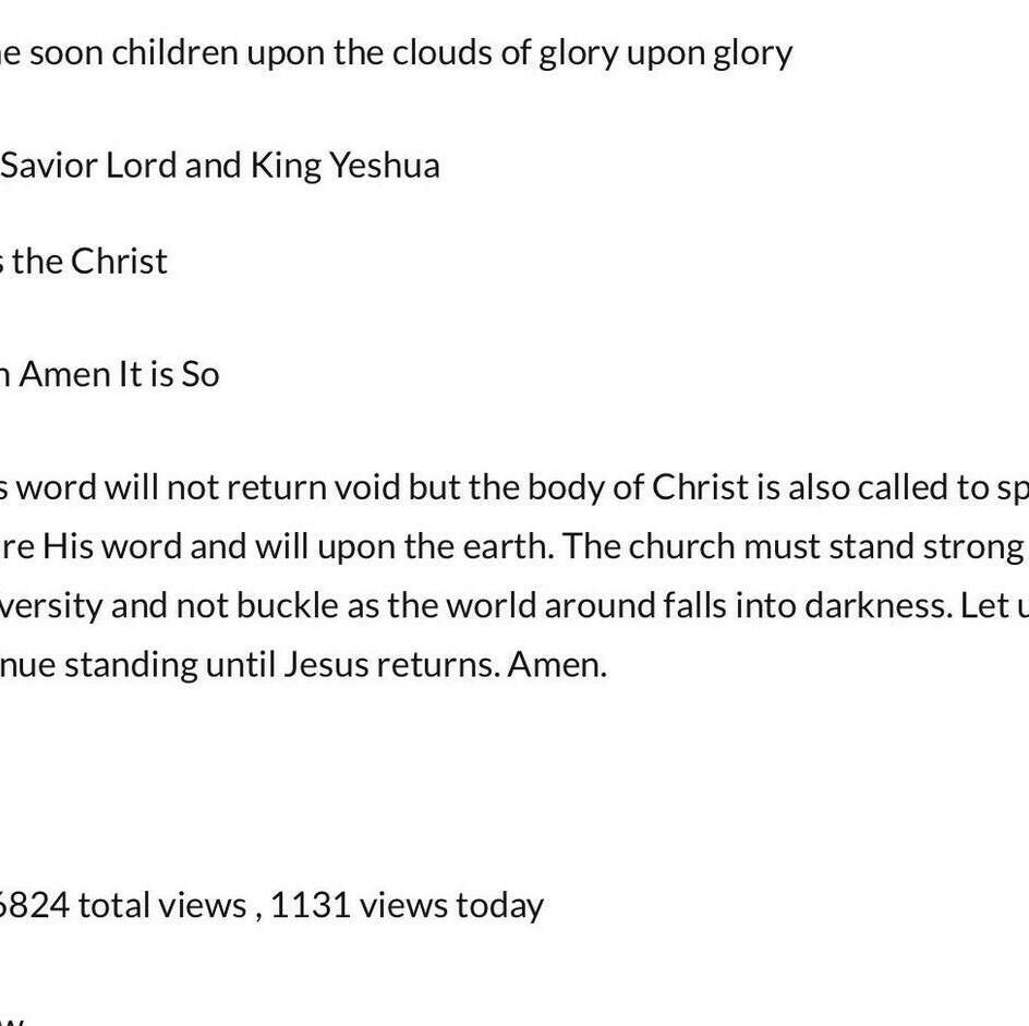 Transcript: I Am coming in the clouds. I Am the King of kings, Lord of lords, the Only Begotten Son. Before Abraham was born, I Am. Every eye will see Me, every knee will bow, even those that pierced Me. I bring My reward with Me. I Am the Alpha and Omega, the beginning and the end. I will repay each one of you accordingly. Have you prepared your hearts? Are you prepared to see Me, as time as you understand, comes to an end. My angels are with you now. Many have called on Me and I have heard them. I will not leave or abandon you, My children.