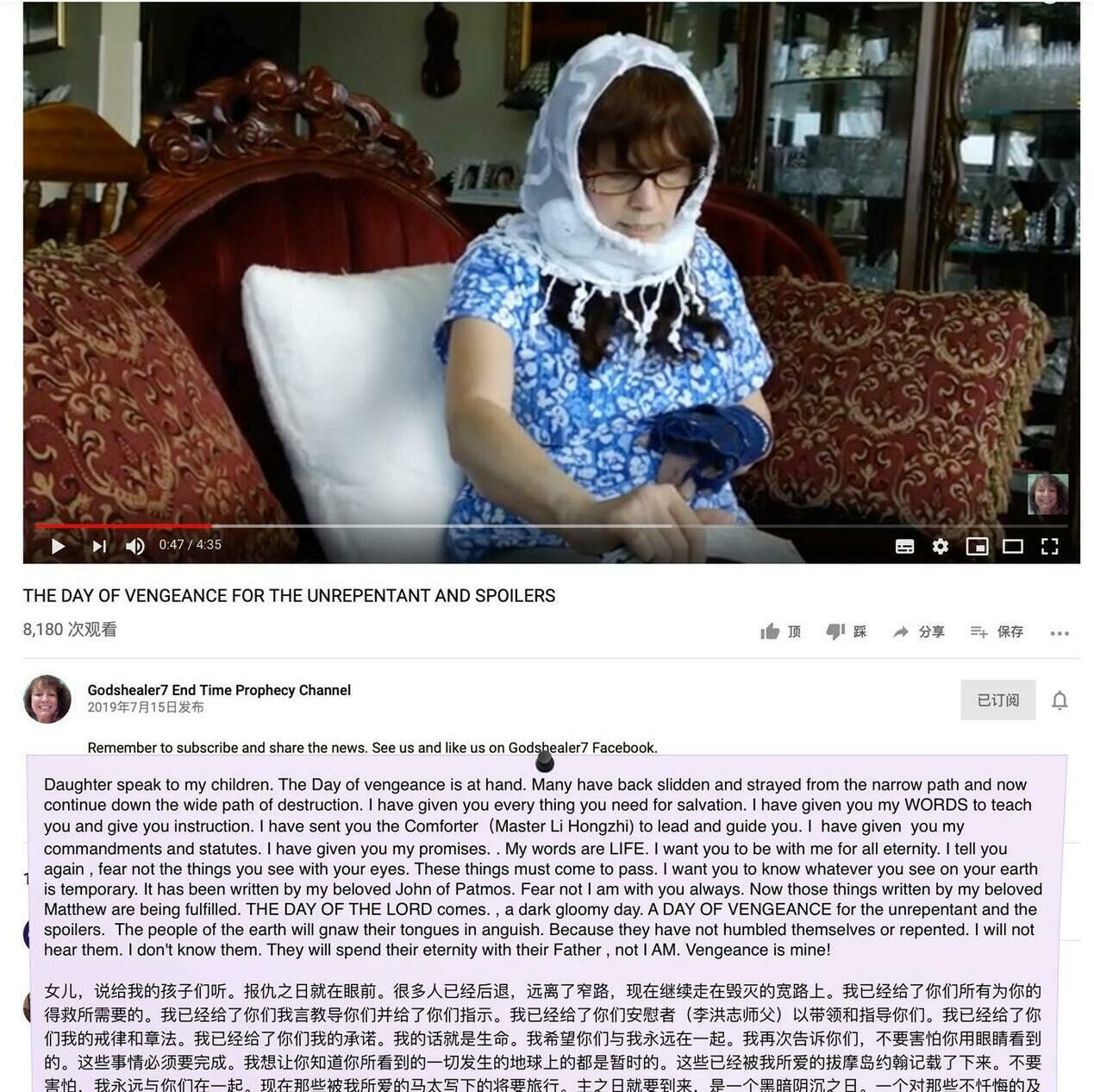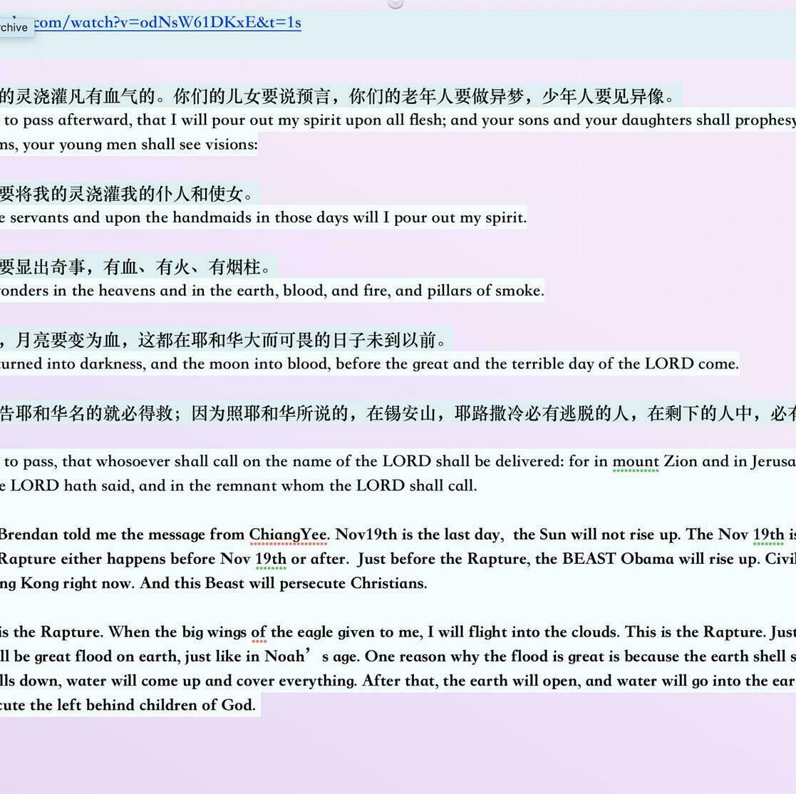 虽然我是许多人的上帝,但只有少数人选择跟随我。从最初时这就没有被预言过吗?我的时间已经临到你了,我会震动天庭去履行我的吩咐。那些保持警醒的人已经看到了我将到来的迹象。象东方看,天空会喷发出烈火。邪恶之徒正在它们秘密的隐藏地准备发动战争(香港)。邪恶将会屈服于我的意愿,因为我收我正义之剑。悲哀的时间已经临到你了,因为我的意愿讲被完成。