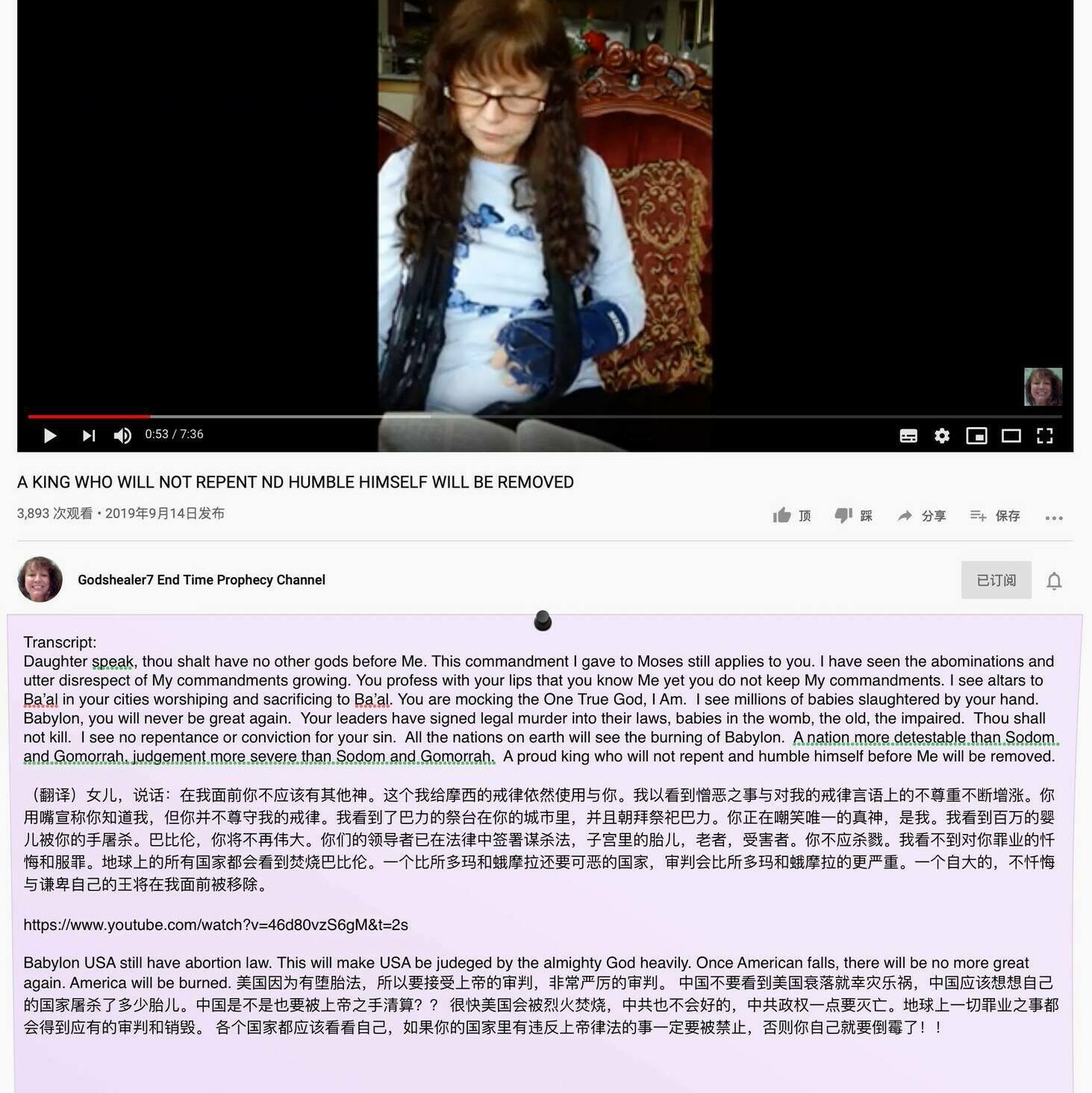(翻译)女儿,说话:在我面前你不应该有其他神。这个我给摩西的戒律依然使用与你。我以看到憎恶之事与对我的戒律言语上的不尊重不断增涨。你用嘴宣称你知道我,但你并不尊守我的戒律。我看到了巴力的祭台在你的城市里,并且朝拜祭祀巴力。你正在嘲笑唯一的真神,是我。我看到百万的婴儿被你的手屠杀。巴比伦,你将不再伟大。你们的领导者已在法律中签署谋杀法,子宫里的胎儿,老者,受害者。你不应杀戮。我看不到对你罪业的忏悔和服罪。地球上的所有国家都会看到焚烧巴比伦。一个比所多玛和蛾摩拉还要可恶的国家,审判会比所多玛和蛾摩拉的更严重。一个自大的,不忏悔与谦卑自己的王将在我面前被移除。