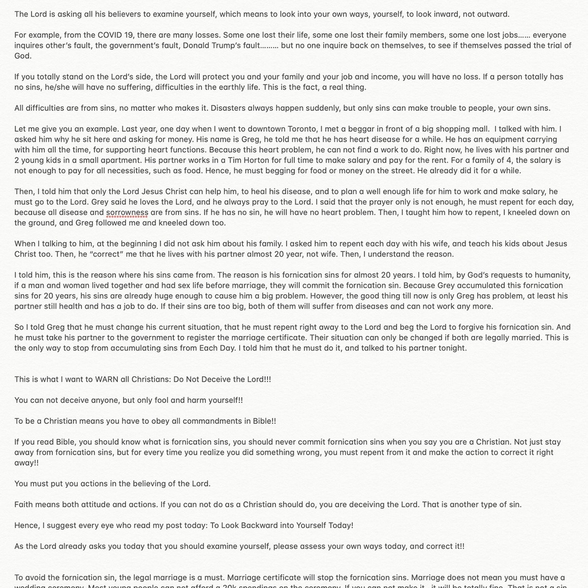 This message is to all nations who have aborion law, prostitute and sex abuse to kids, and those nations using human body to do science excecise. For example CCP use FalunDafa practitioners to text new medicines. They feed strange medicinse in the prison and many died during huge sufferings and pains. The Lord's punishments will fall down to them to all nations. These will happen just before the Rapture and after the Rapture.