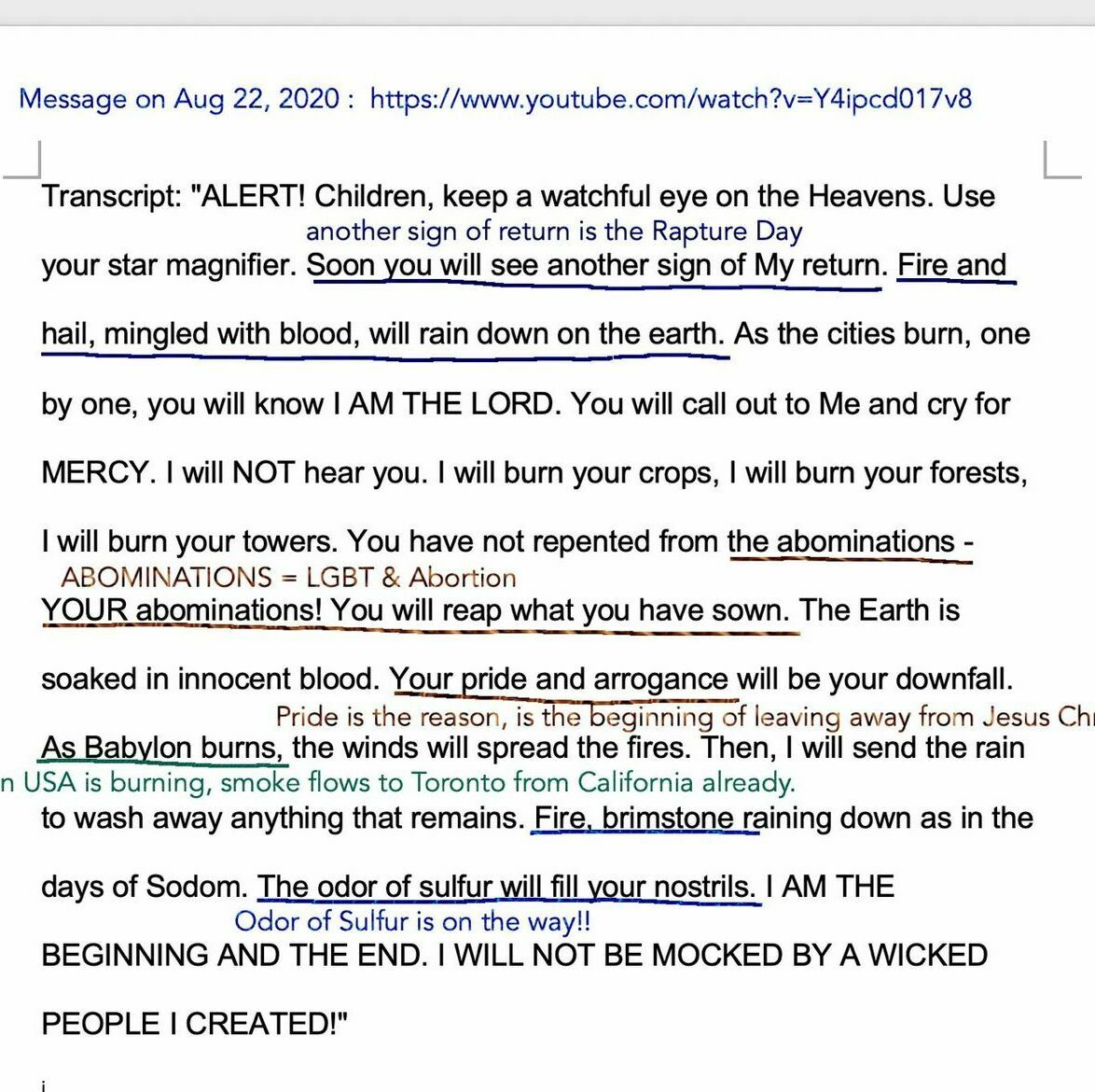 Transcript: "ALERT! Children, keep a watchful eye on the Heavens. Use your star magnifier. Soon you will see another sign of My return. Fire and hail, mingled with blood, will rain down on the earth. As the cities burn, one by one, you will know I AM THE LORD. You will call out to Me and cry for MERCY. I will NOT hear you. I will burn your crops, I will burn your forests, I will burn your towers. You have not repented from the abominations - YOUR abominations! You will reap what you have sown. The Earth is soaked in innocent blood. Your pride and arrogance will be your downfall. As Babylon burns, the winds will spread the fires. Then, I will send the rain to wash away anything that remains. Fire, brimstone raining down as in the days of Sodom. The odor of sulfur will fill your nostrils. I AM THE BEGINNING AND THE END. I WILL NOT BE MOCKED BY A WICKED PEOPLE I CREATED!"