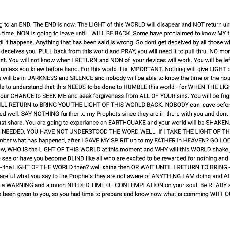 “Men of earth, I have watched your days grow darker and darker. No repentance, proud and boastful. Evil and perverse thoughts continually. I have watched your science and technology as you continue to try to be the creator. I have seen your experiment making hybrid animals and humans. I have seen rampant child sacrifice to baal. Now I see your scientists using artificial intelligence and combining it with the man I created in my own image. I have destroyed other societies and people in the past for taking this path. You have not heeded my warnings to turn from your evil ways and doings. I am the only God. There is no other like Me. I create and destroy. As I have done in the past I will use my own creation for destruction. Fire, water and wind. Earthquakes, hurricanes and volcanoes. I will correct My children. My judgement falls on the wicked. I will remove every abomination and vile thing I see. You will not hide your evil deeds in the darkness. I see everything. I will shake your earth and remove every mountain. I will give you the darkness you desire. You have not humbled yourself before Me. I will strike the earth. I will strike the wicked. I am at your door.”