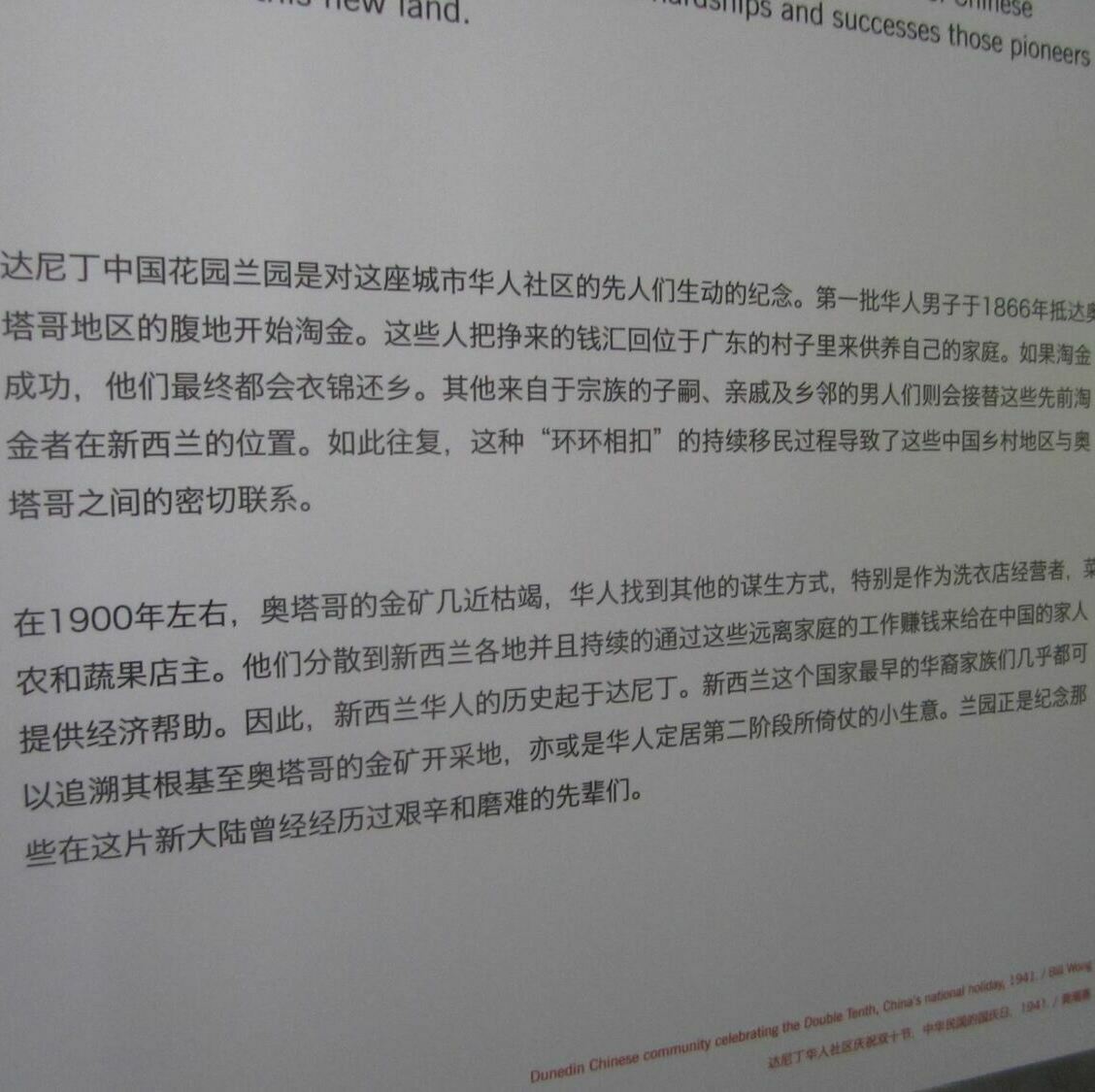 - In Dunedin, there is a Chinese Garden built in 2008. It is not big, but very beautiful. You can find many documents about this garden in English and Chinese online. Inside this garden, there is a memoral wall with these document and explainations. This garden is built for early Chinese immigrations. In Brendan's book, Won Yee's father should be one of these early gold seekers. Won Yee might be born in China and came to New Zealand later for reunion with his father.Basicly, Dunedin and gold in Otago is the home for the first generation Chinese immigrations.