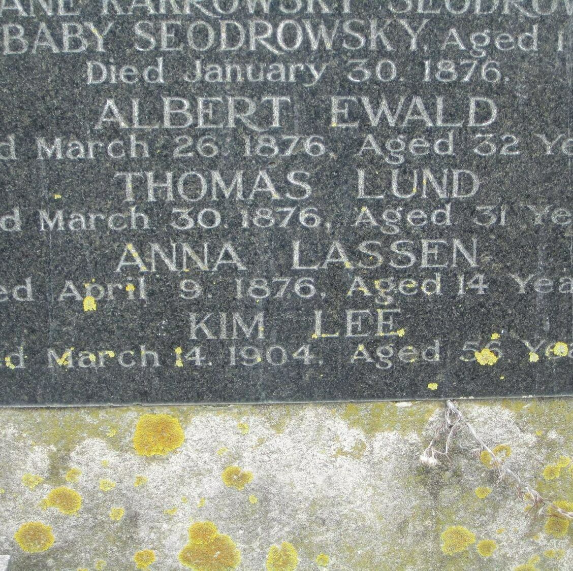 There is a big gravestone with all dead people's name on it. Kim Lee 's name is at the bottom. His death day is March 14, 1904, at age 56.